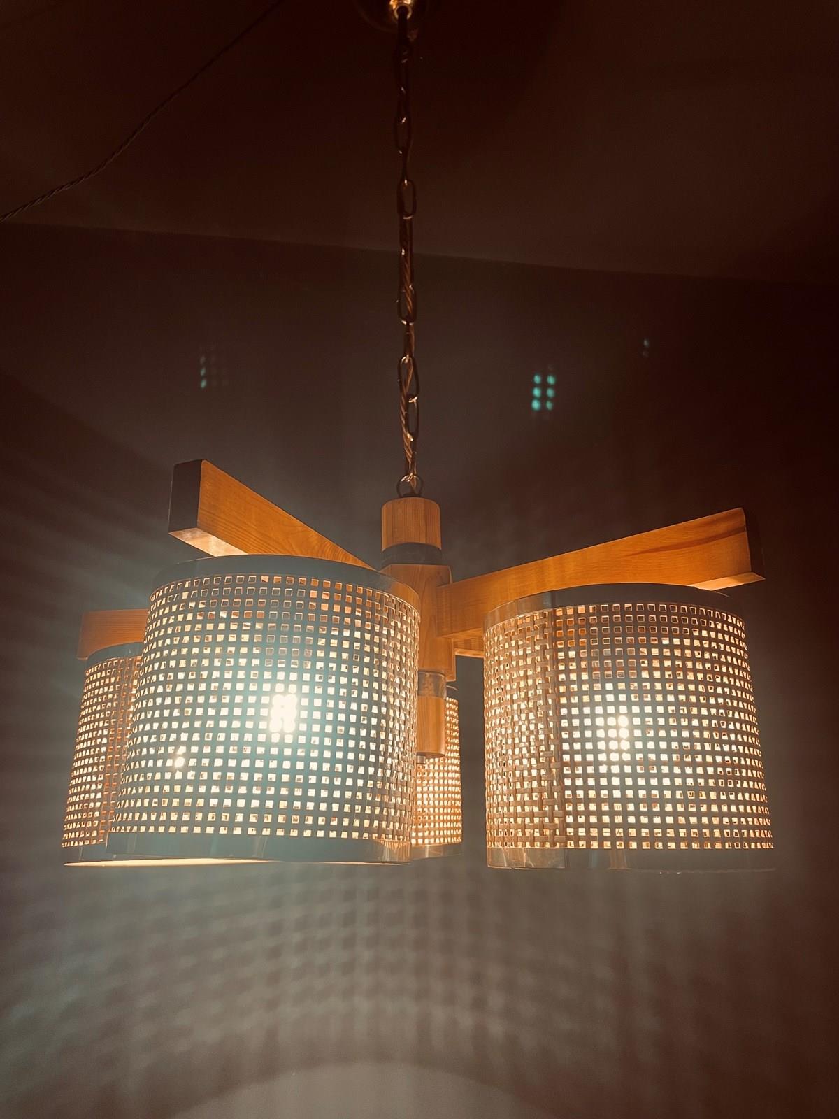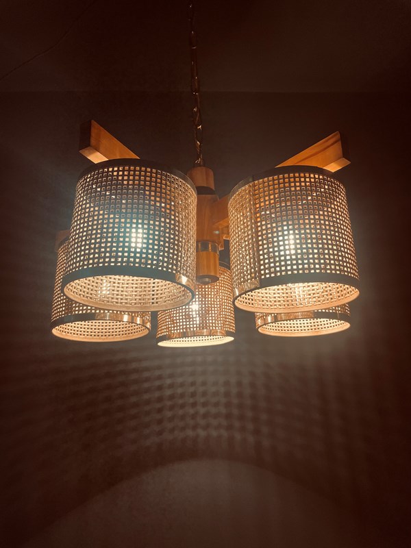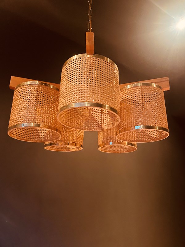 The main body is made from teak with brass fittings and five cylindrical rattan shades, each housing one e14 bulb holder.