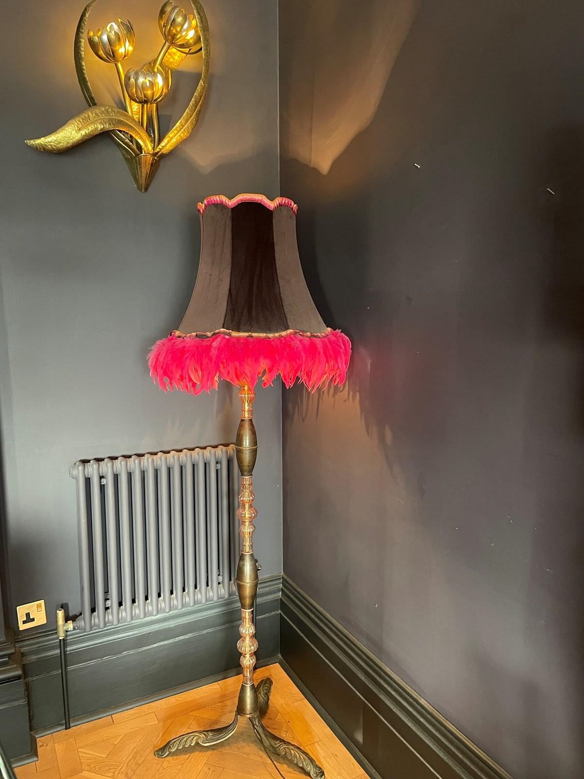 Pink glass and brass with a bespoke lampshade. The lampshade is made from a high quality velvet with ribbon sourced from V V Rouleux in Marylebone.