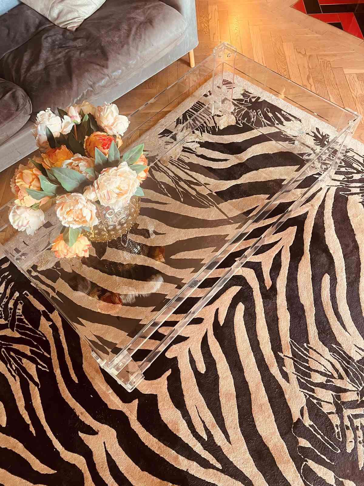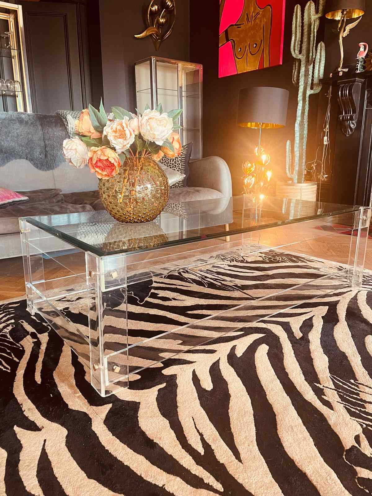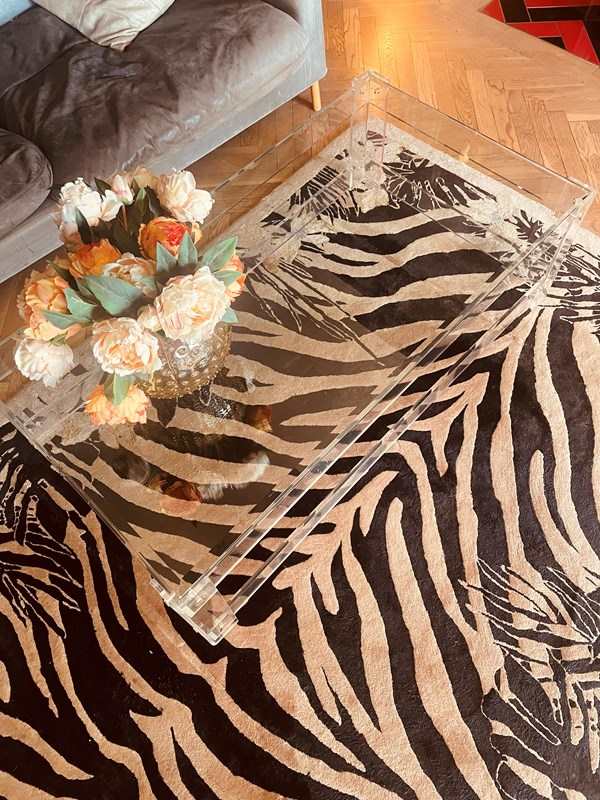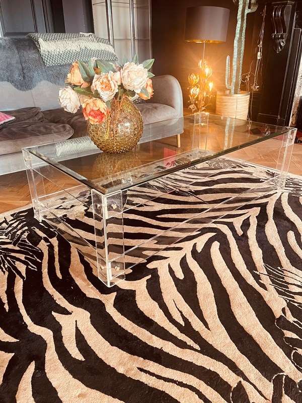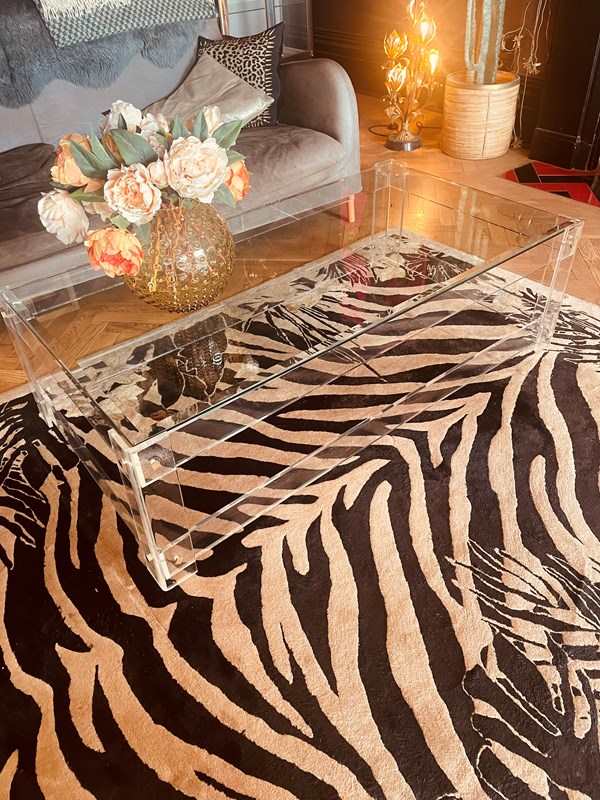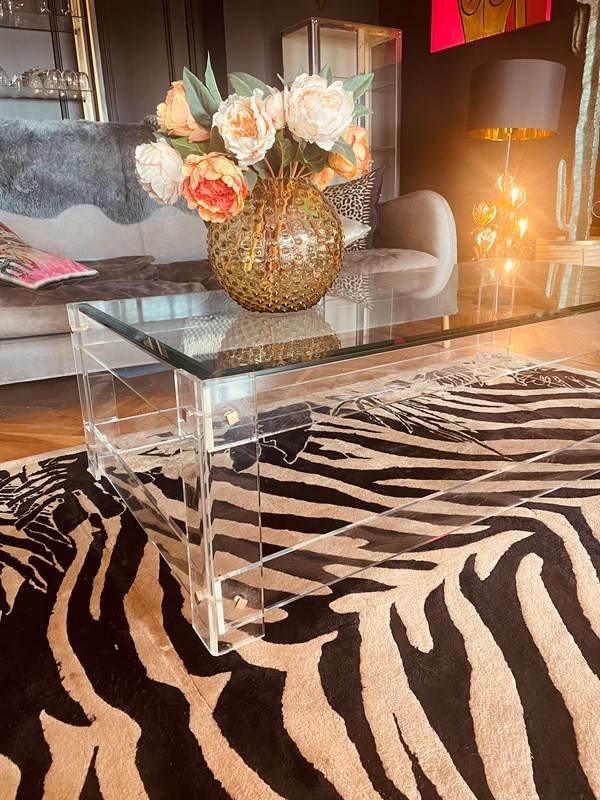 Made from lucite with gold metal bolts, and 10mm inlaid, bevelled glass top.