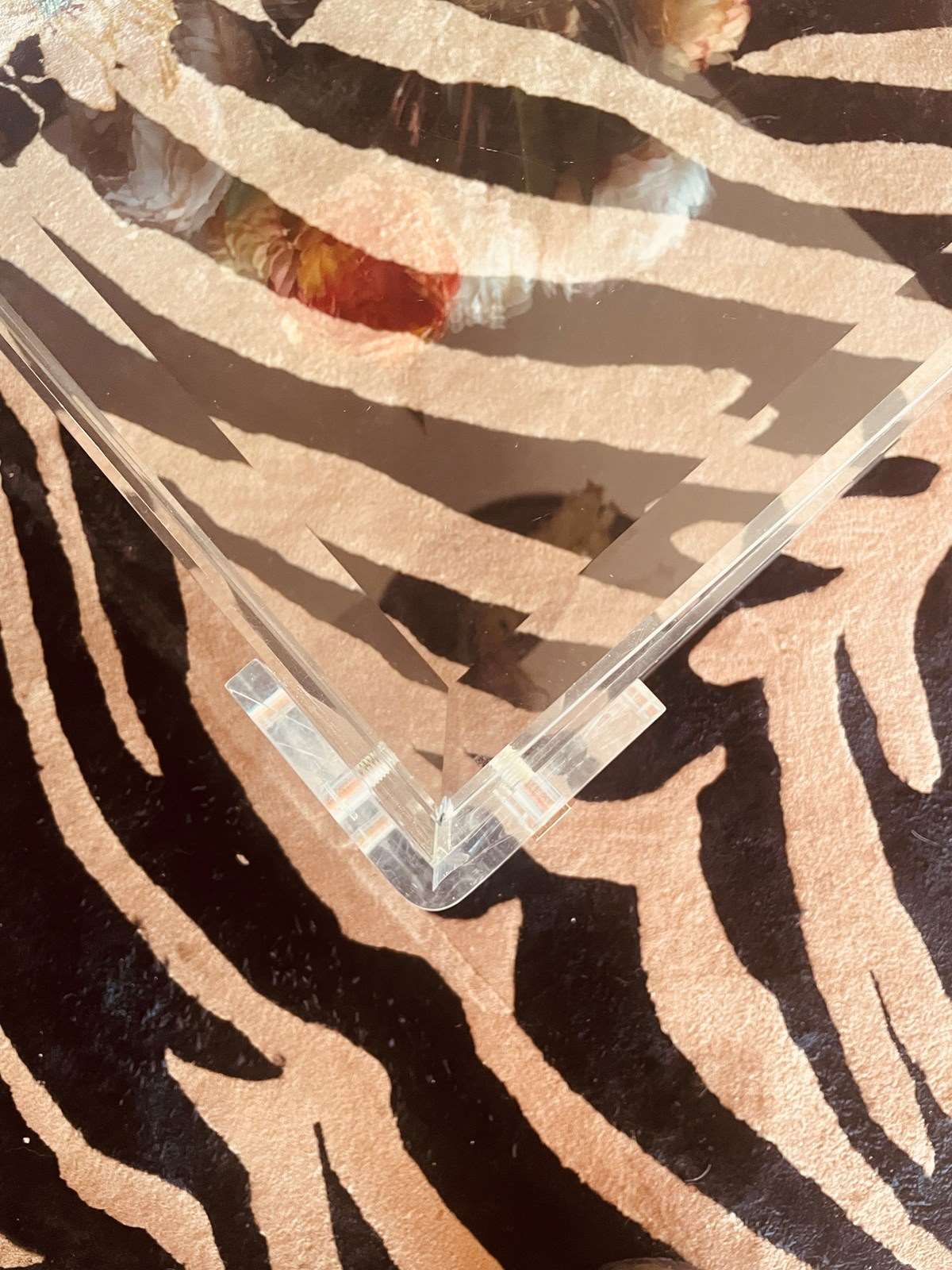 It’s hard to keep lucite in good condition but this is in very good condition for its age. There is a ding to one corner of the glass on the underside corner. It doesn’t detract in my opinion, please see the last photograph.