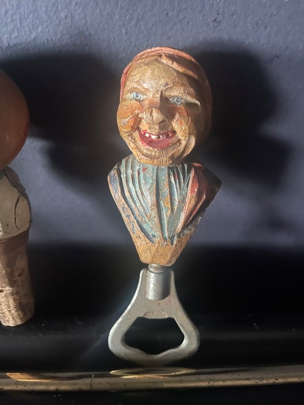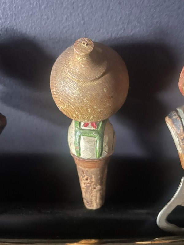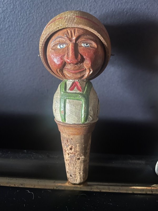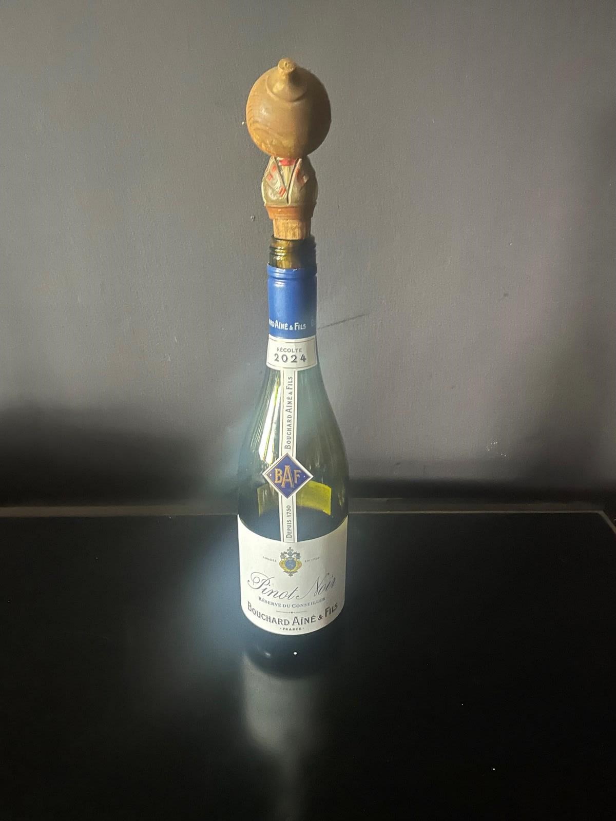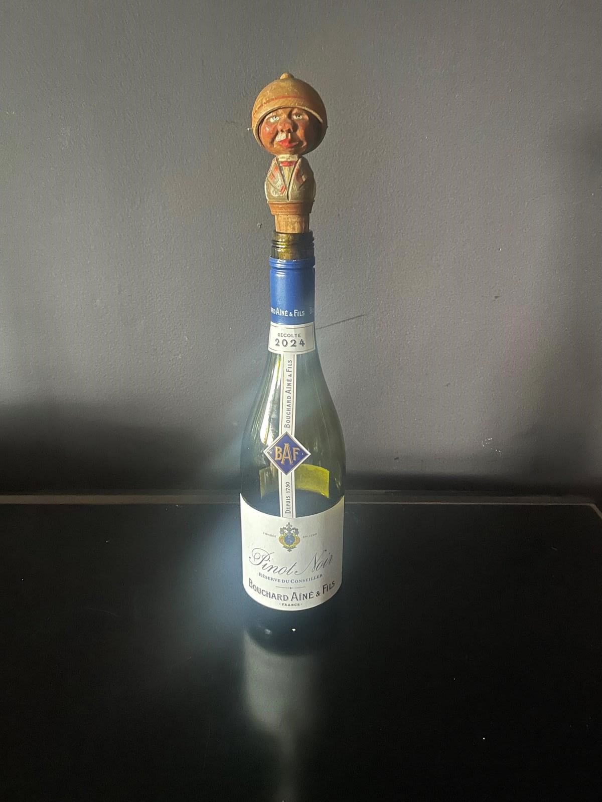The bottle stopper has a rotating hat, presumably covering the face when too much wine has been drunk! 🥴