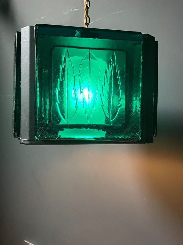 Pentagonal in shape, the frame is black metal and there are five, leaf embossed panels that slide out of the top. There is a frosted glass diffuser within the panels that holds one bulb.