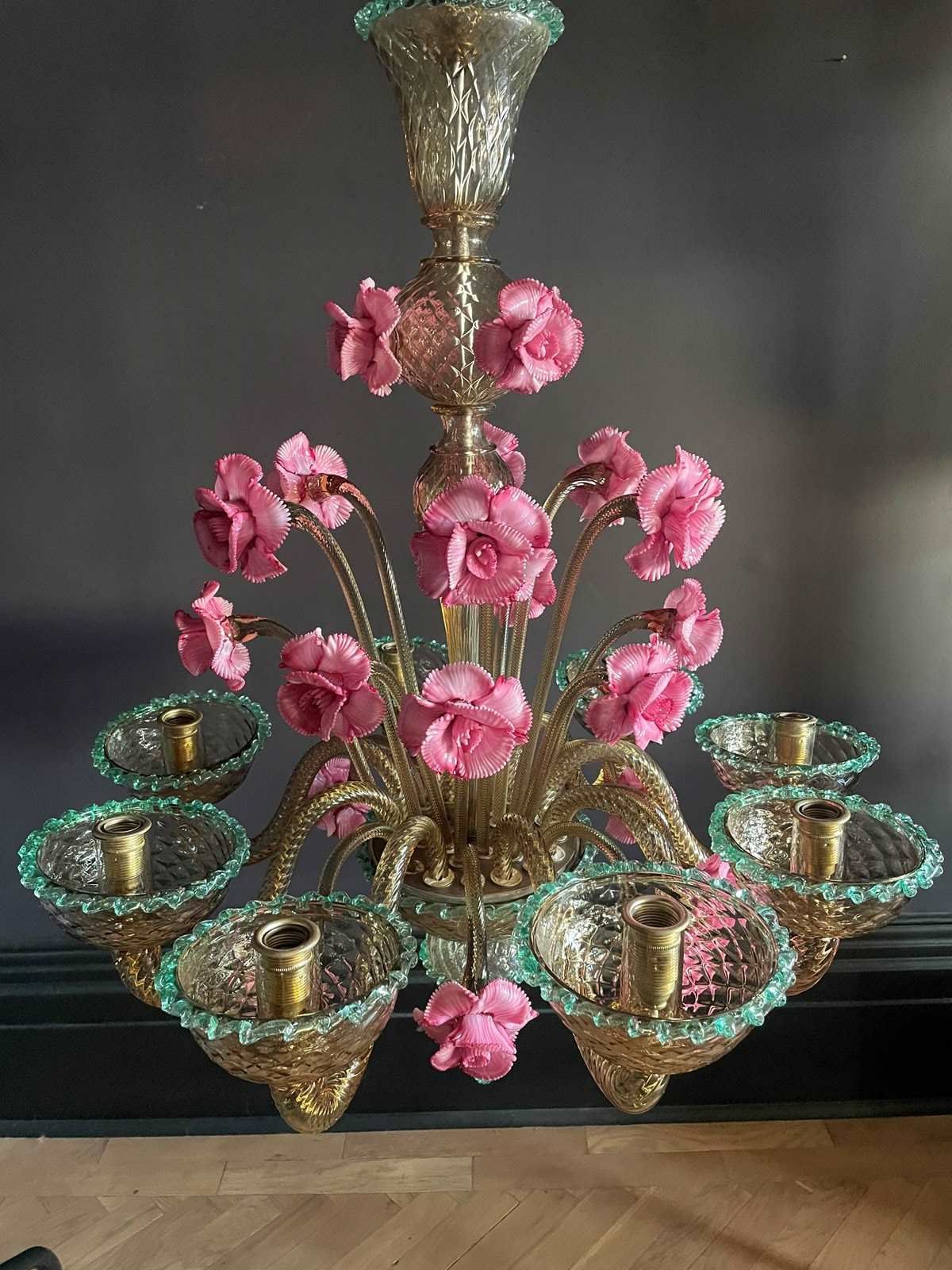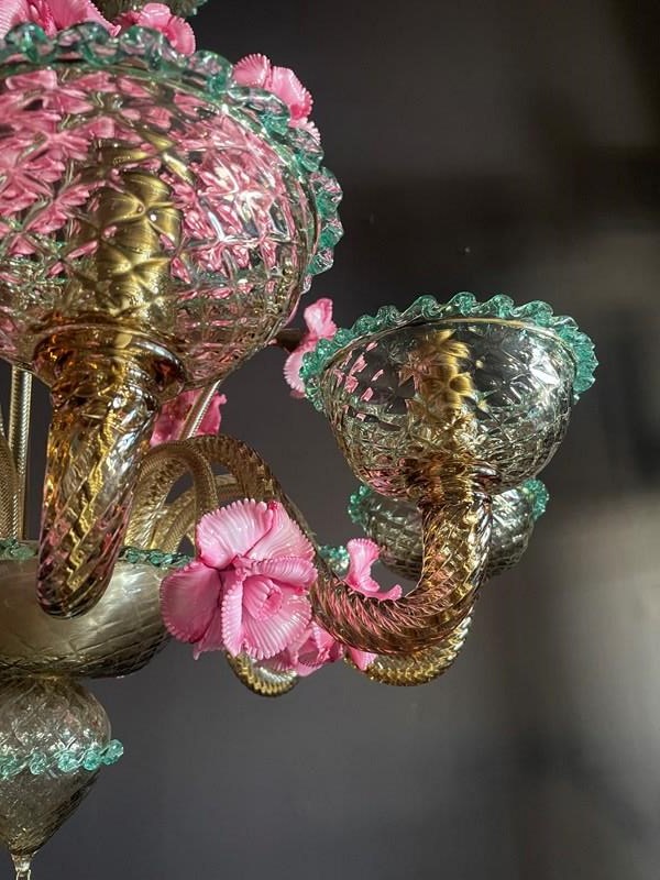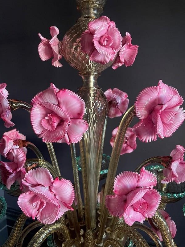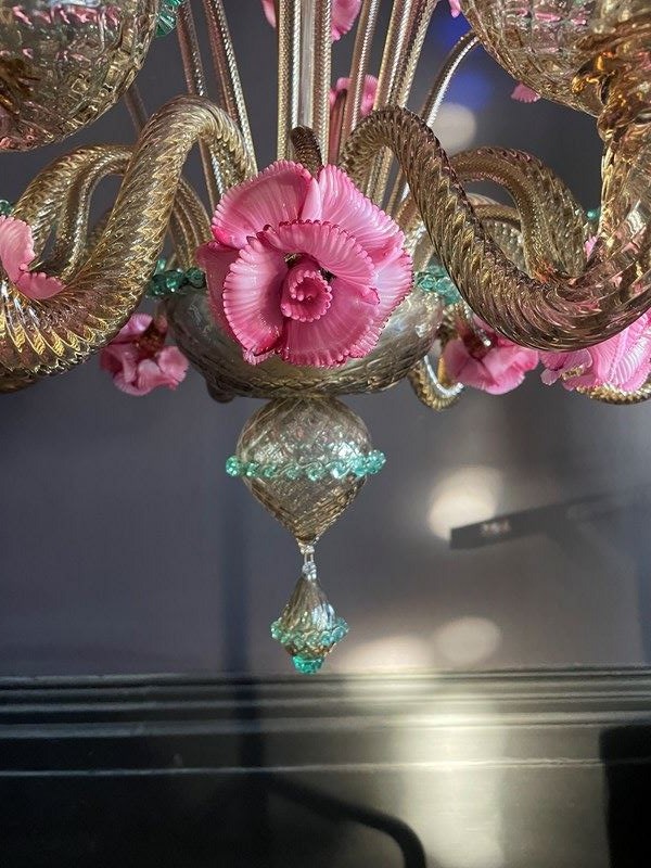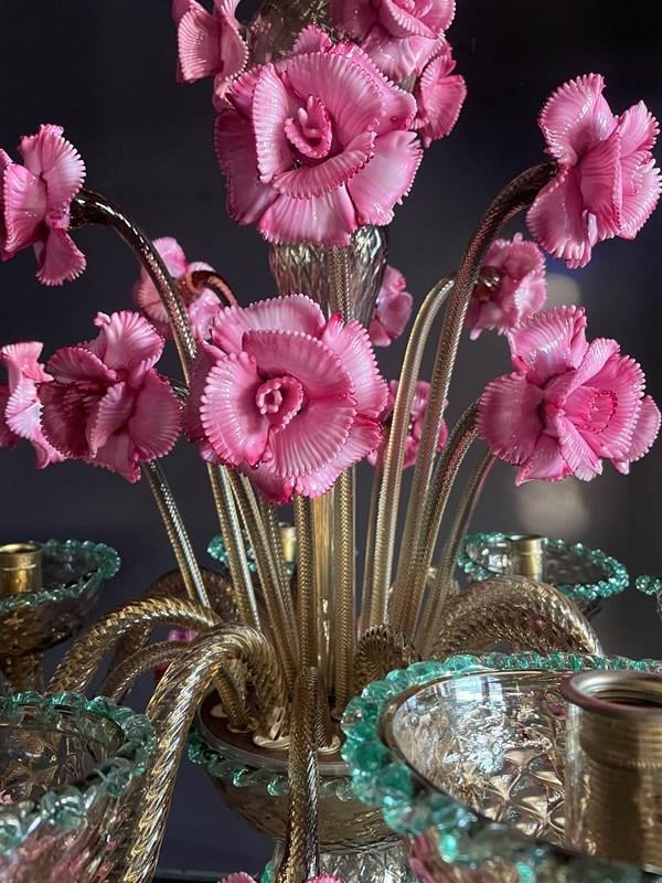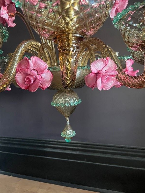 This is a huge chandelier from Murano: flecked with gold with three, different height pink flowers and contrasting green trims.