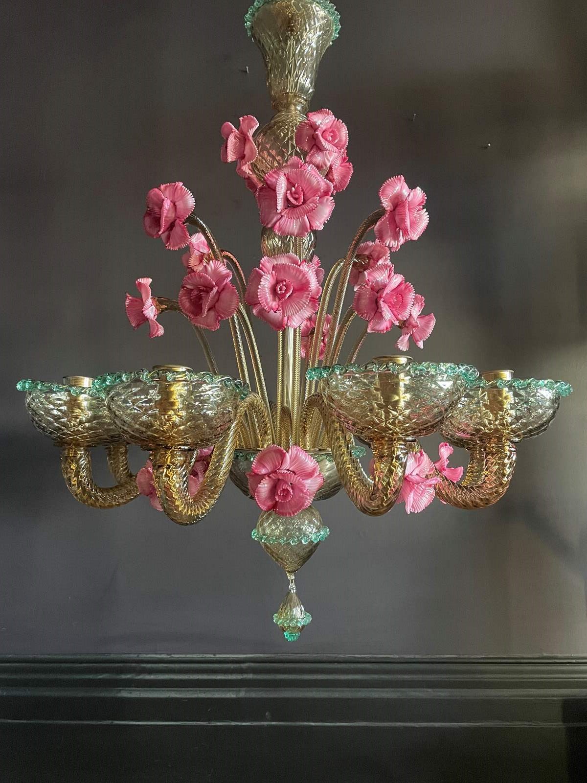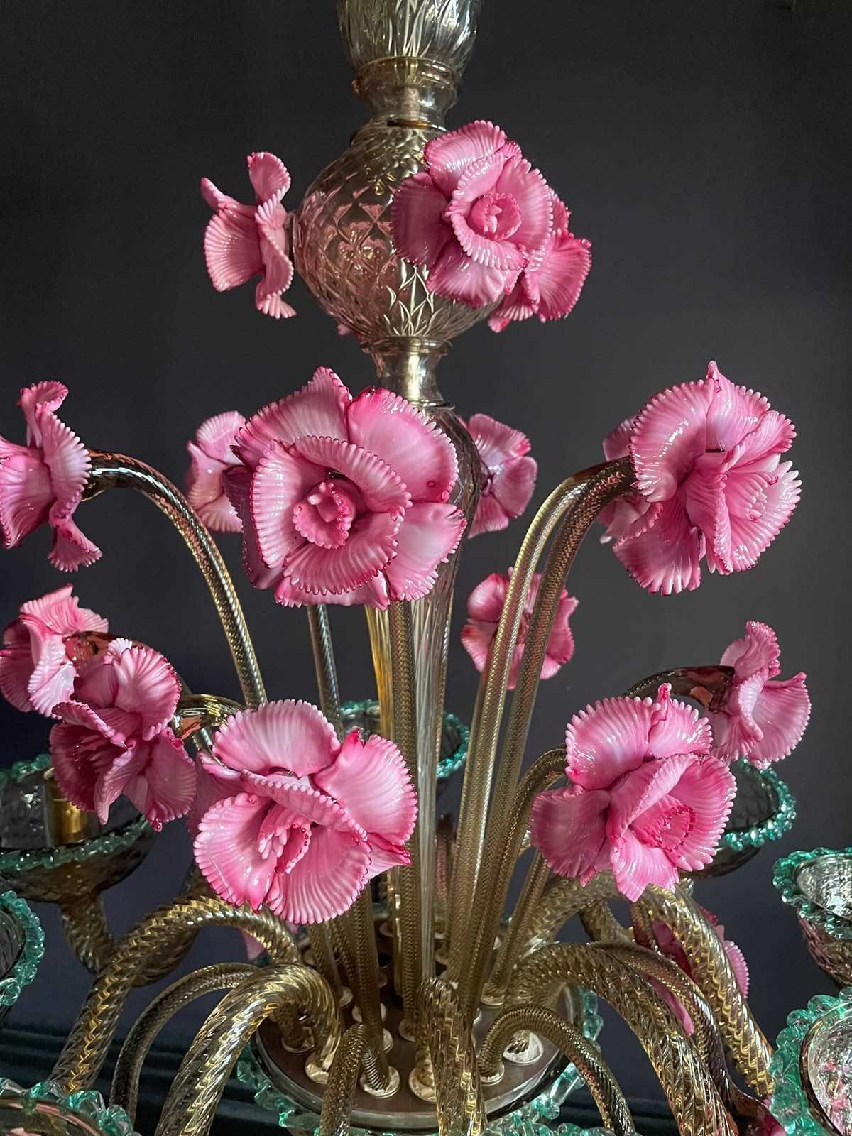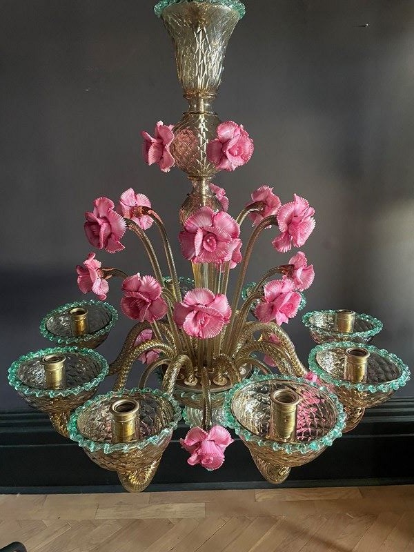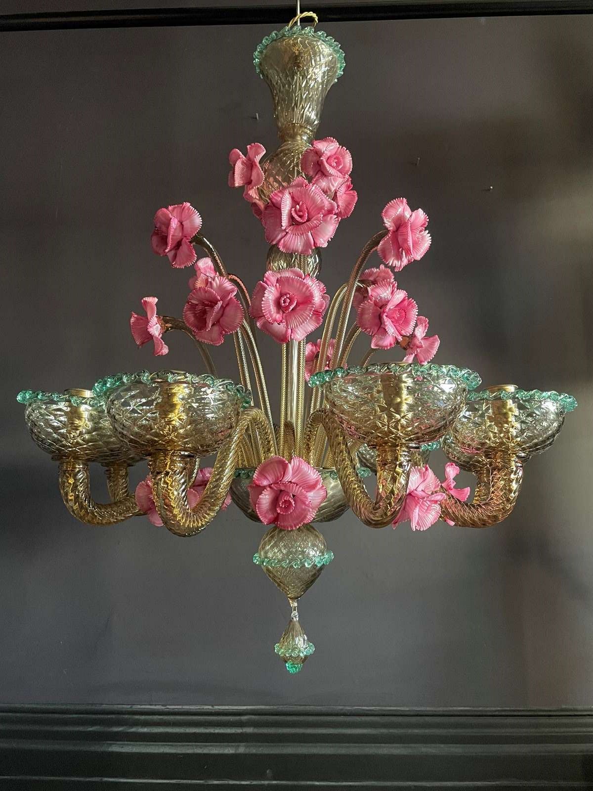 This is a huge chandelier from Murano: flecked with gold with three, different height pink flowers and contrasting green trims.