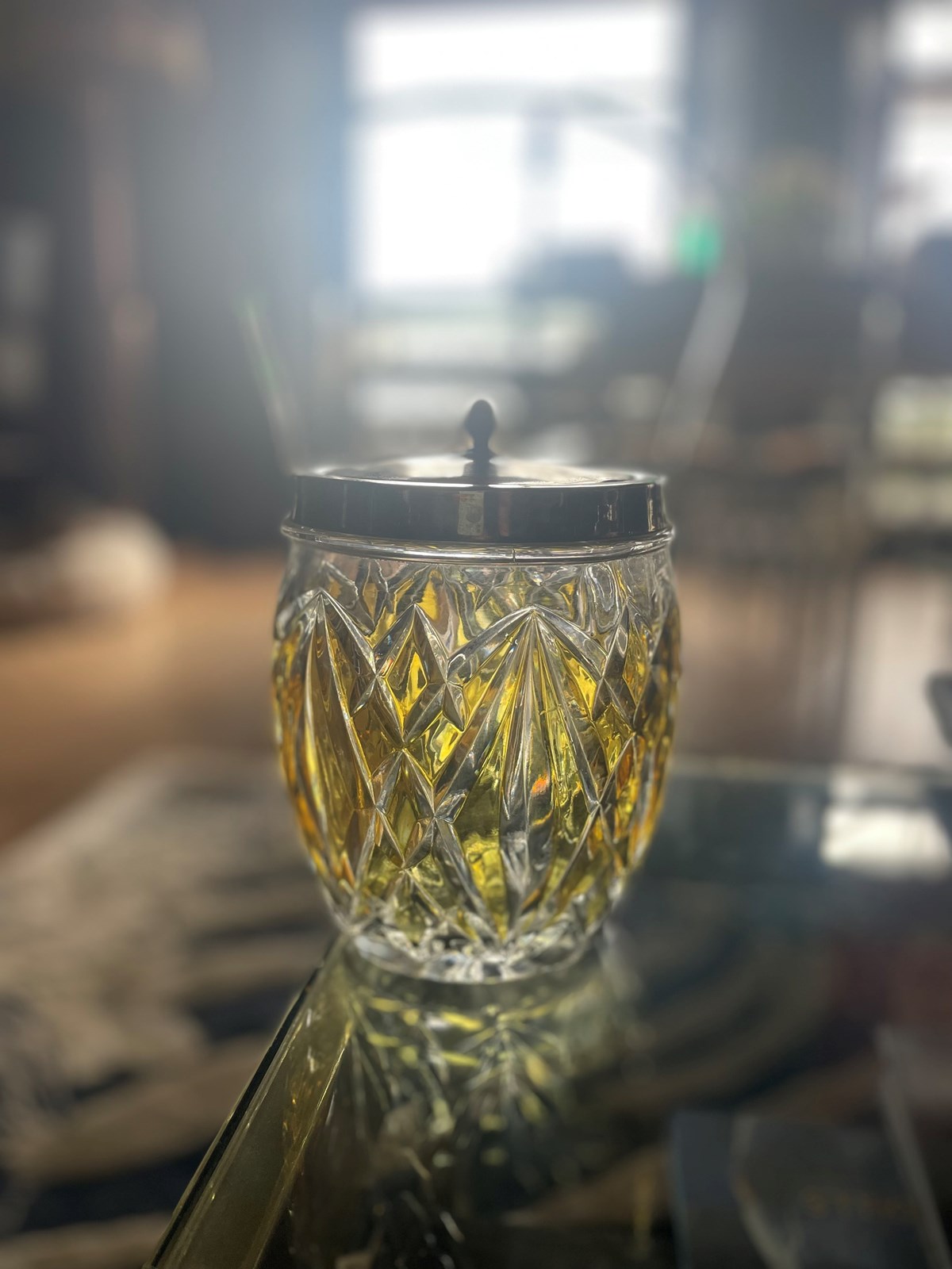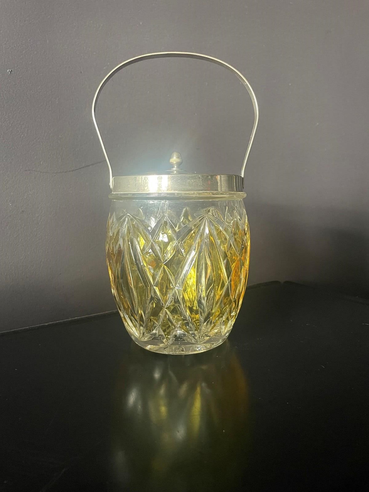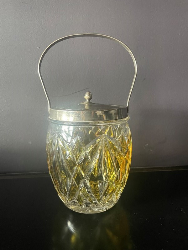 Heavy, high quality crystal glass base with a central tint of chartreuse, and a fine handle and lid made from silver plate.