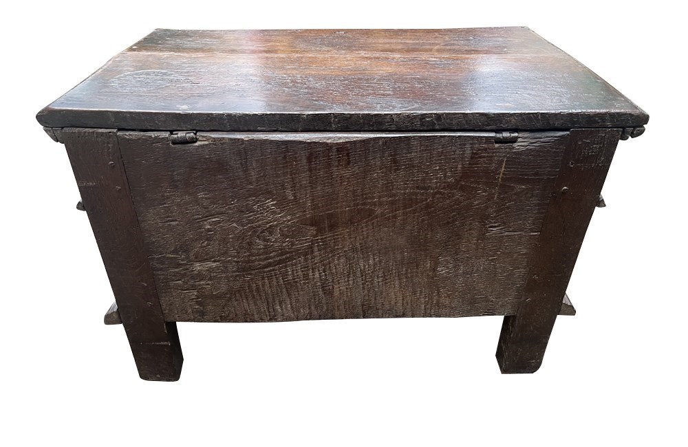 Raised on block feet, the coffer retains a rich , time-worn patina.