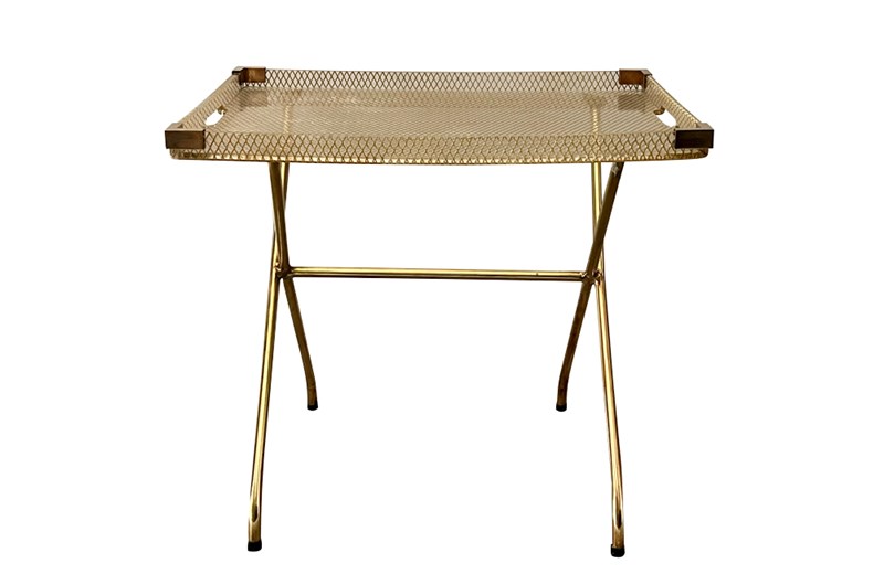 Large lucite tray with brass corners and embedded mesh with two incorporated handles It sits on a separate brass stand.
