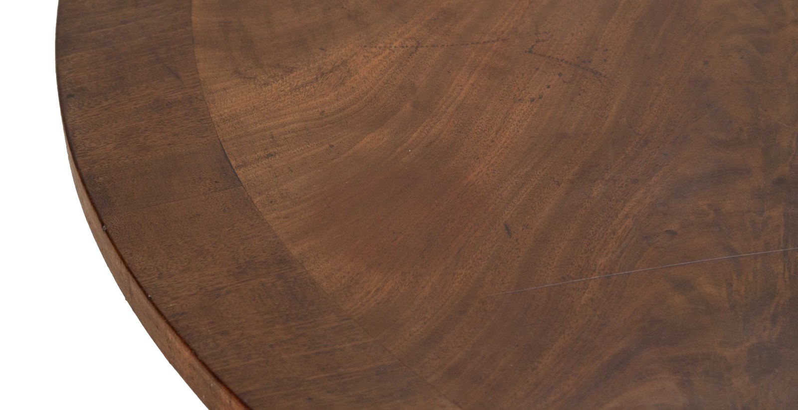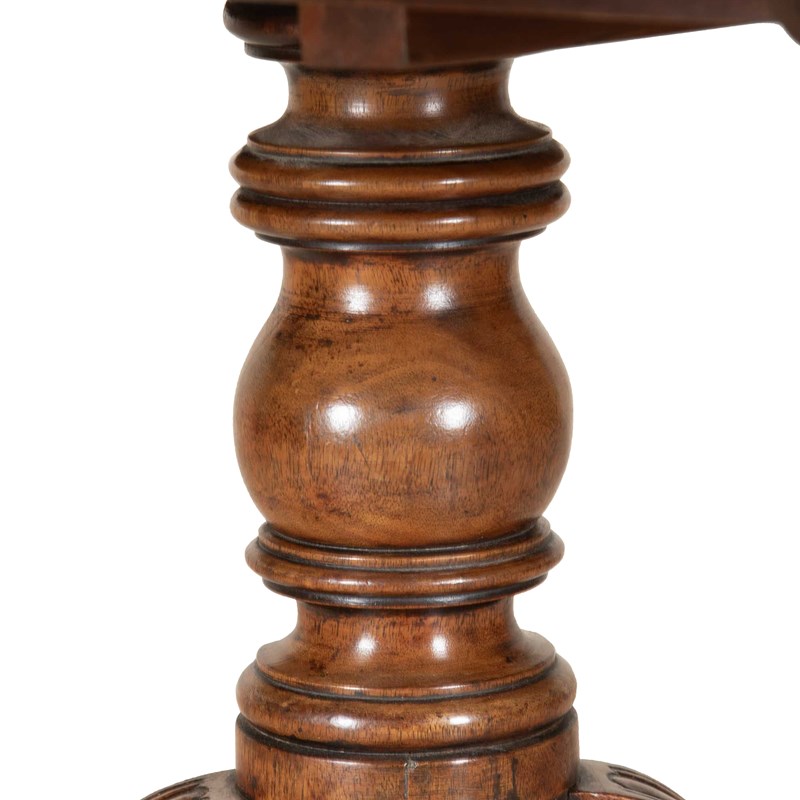 In richly figured mahogany, mid-19th Century. The circular top, veneered in beautifully book-matched flame mahogany, tilts vertically on its locking mechanism. It is raised on a turned pedestal issuing four sabre legs, each terminating in finely cast brass lion-paw caps with concealed casters.