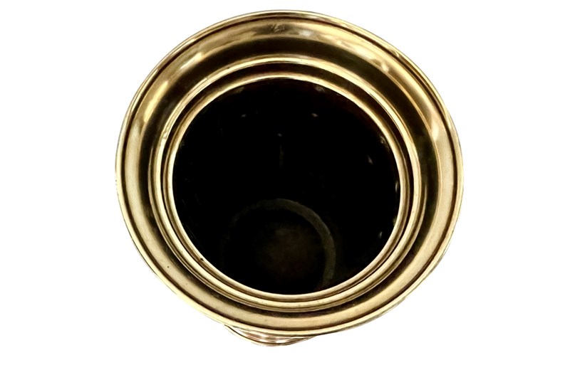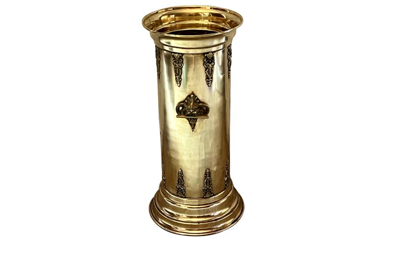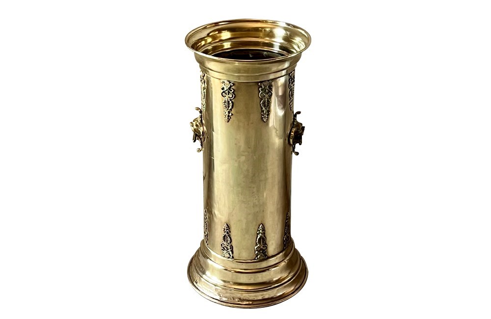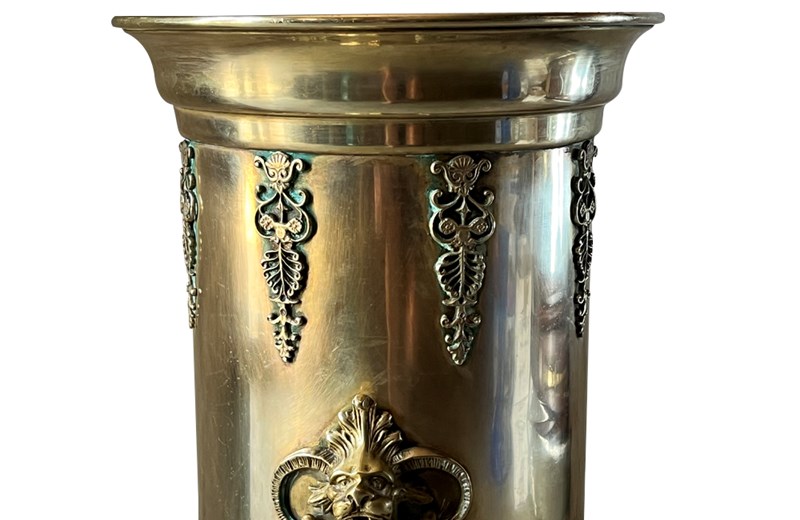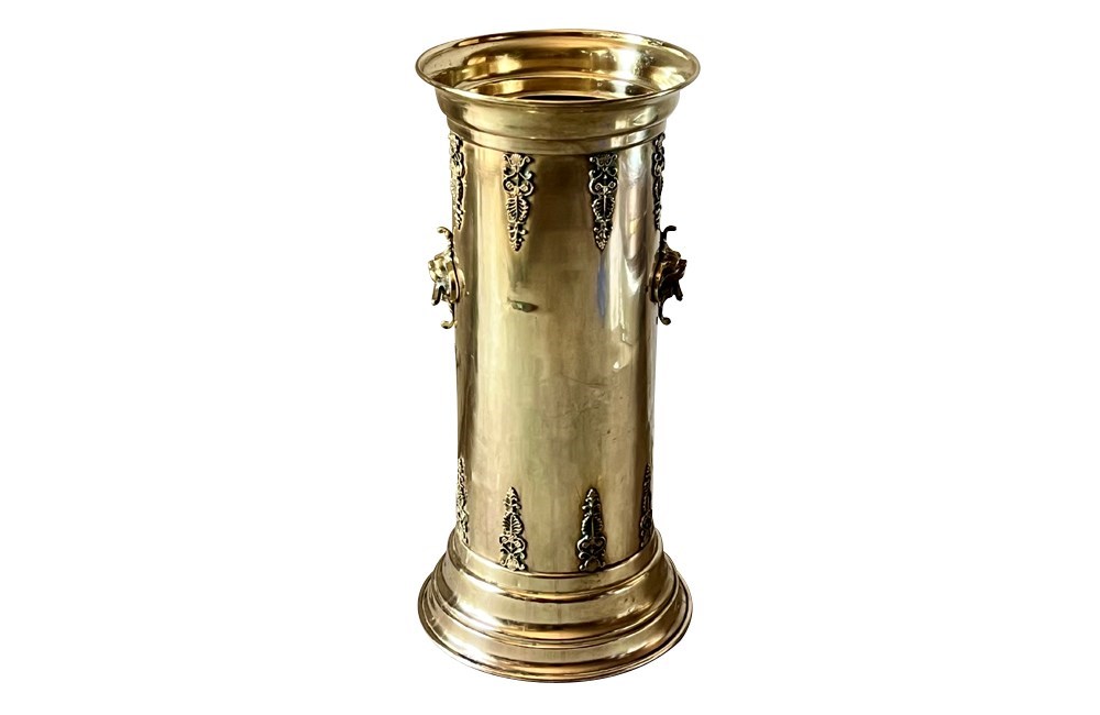 Very decorative brass umbrella or stick stand with lion head and bar handles and neo-classical style ornamentation. France 19th century