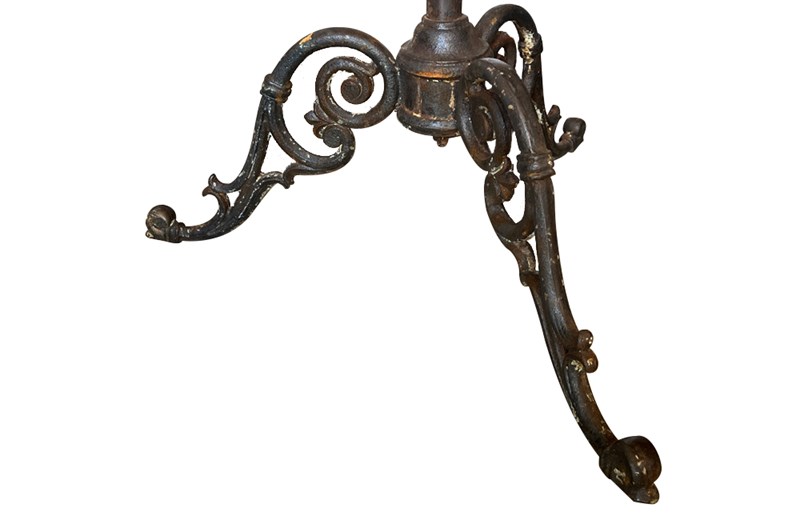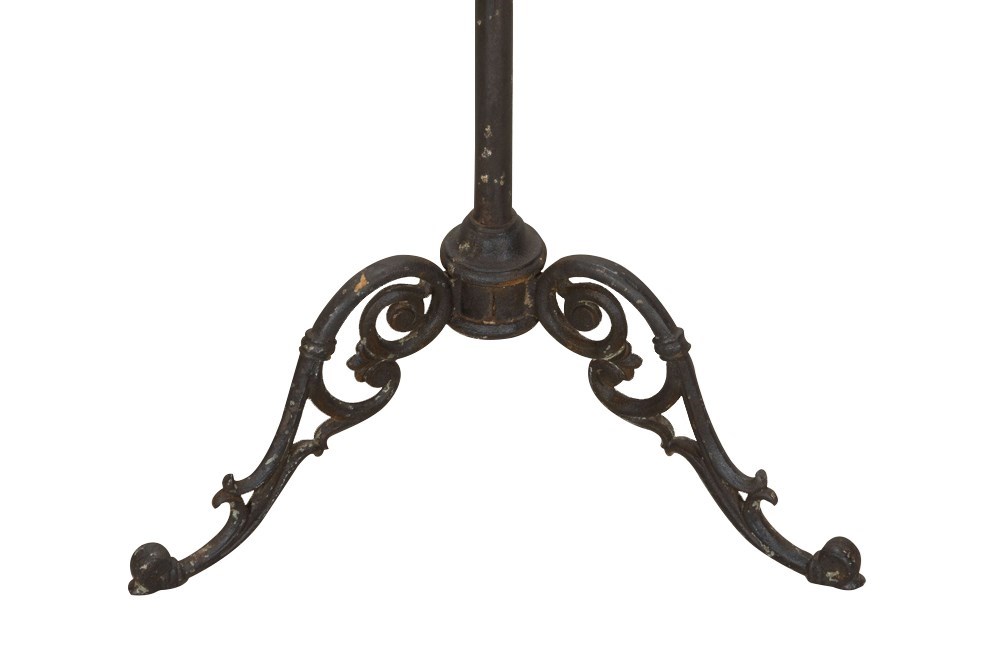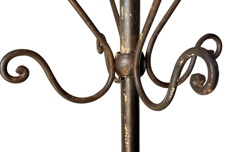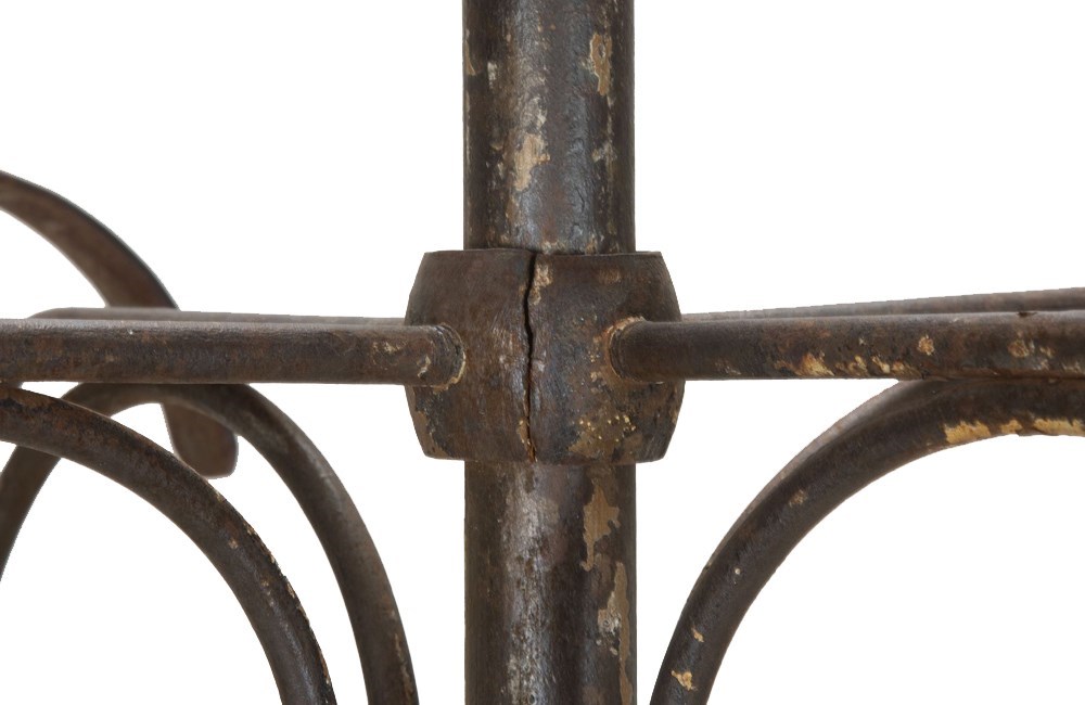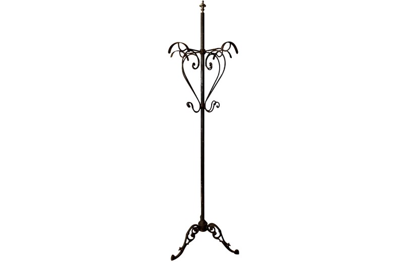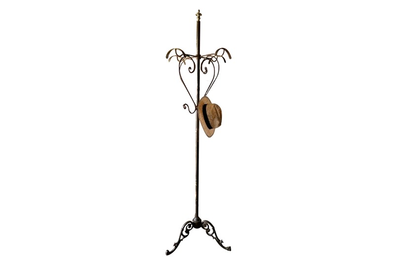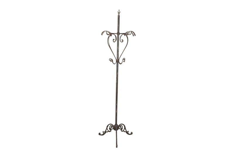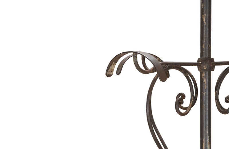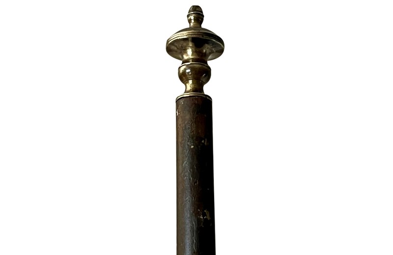 With a rotating ring, four large upper hooks and four lower curved hooks. Topped with a brass urn finial.