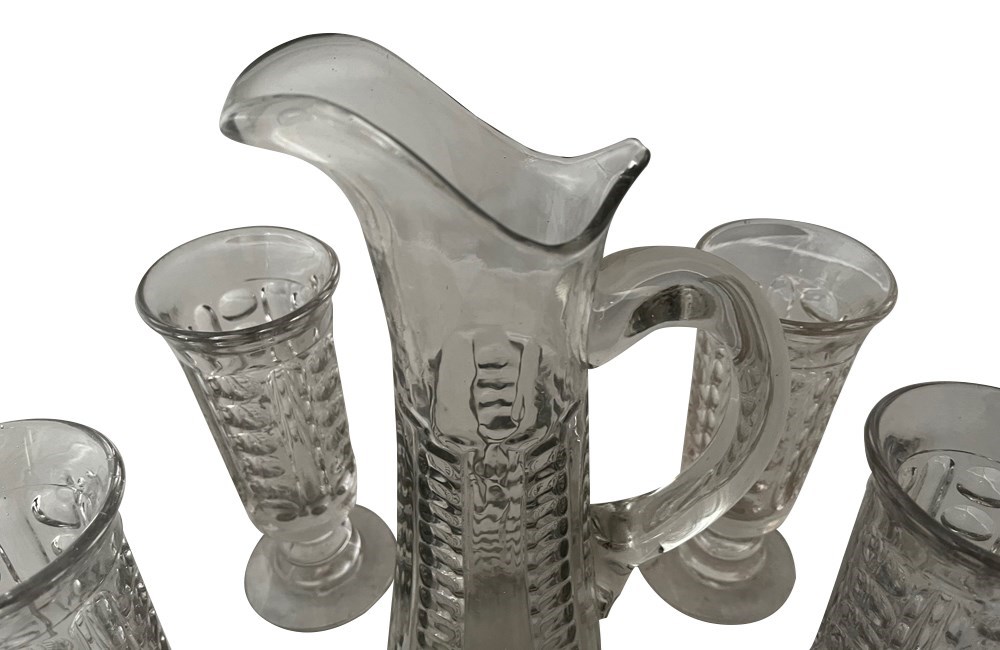 French Normandy glass cider jug and four matching tall stemmed glasses. Circa 1900