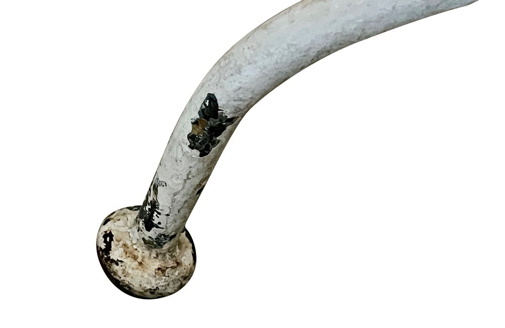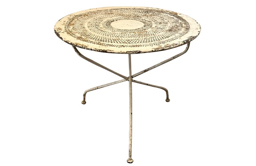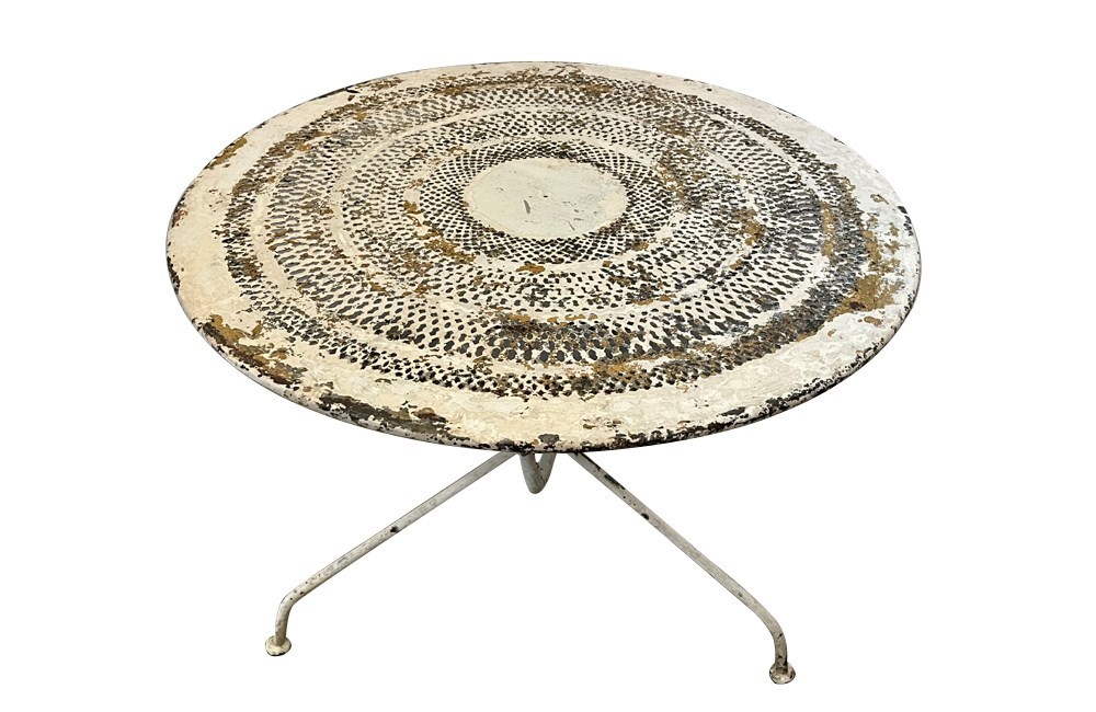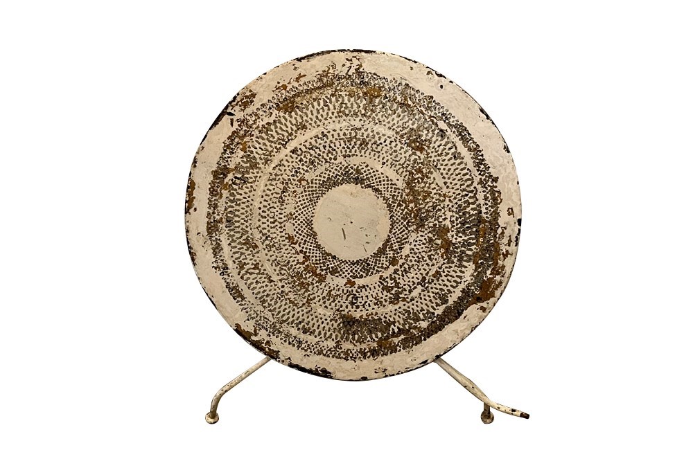 This round iron table of good size features a decorative pierced top and lovely patination. It is equally suitable for use as a garden or interior table.
