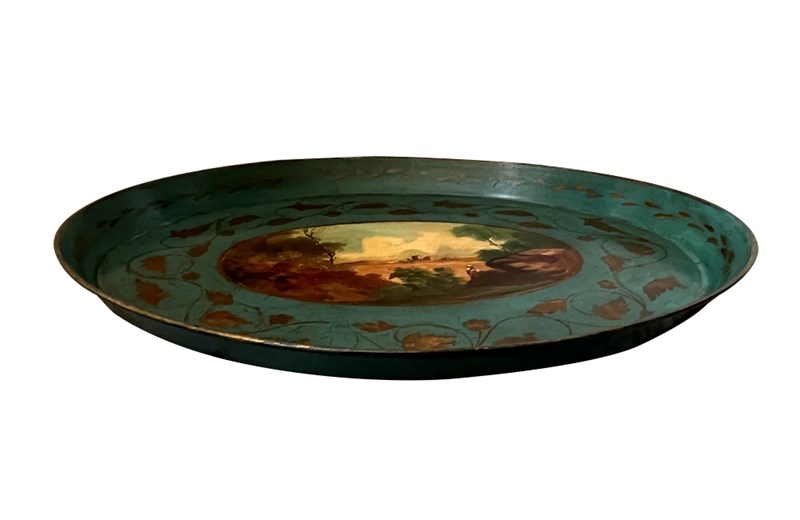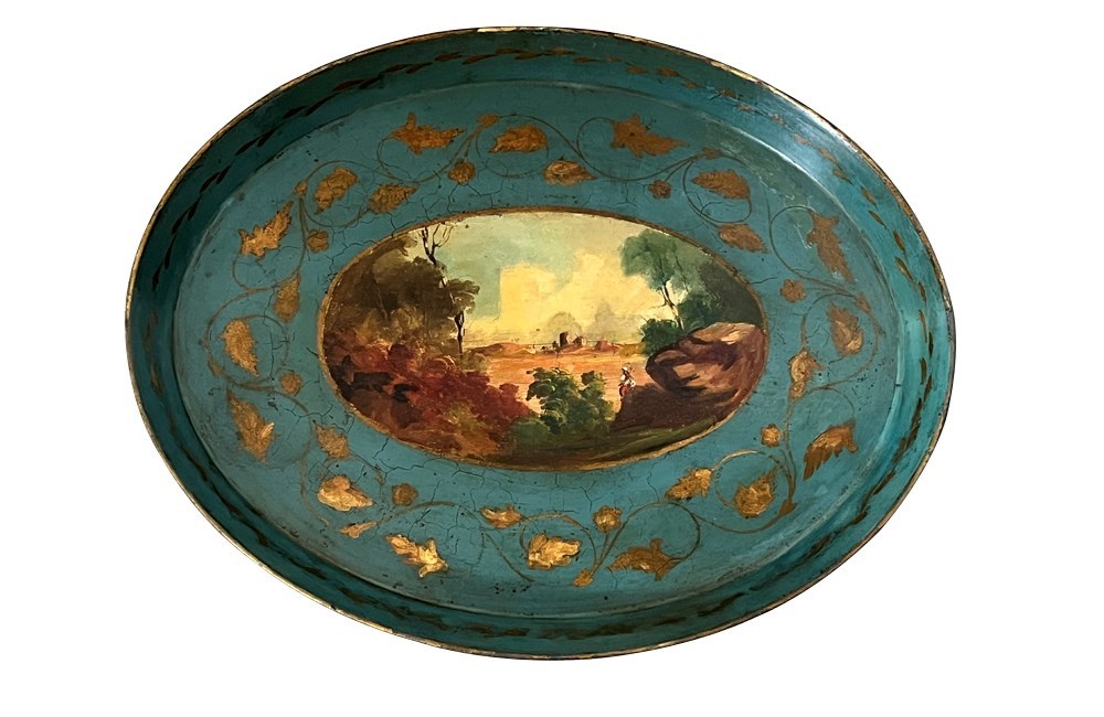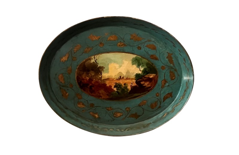 To the centre is an oval painted Italian landscape with figures. The surrounded in a lovely blue finish with a gold foliate motif border.