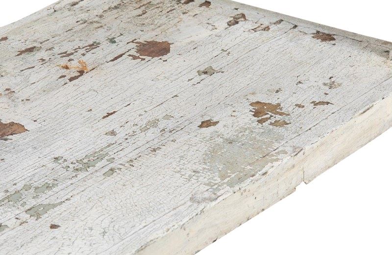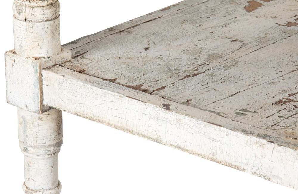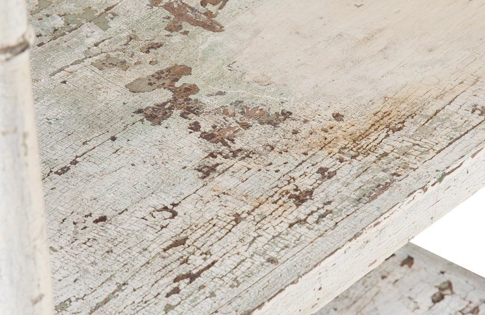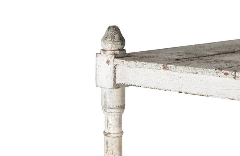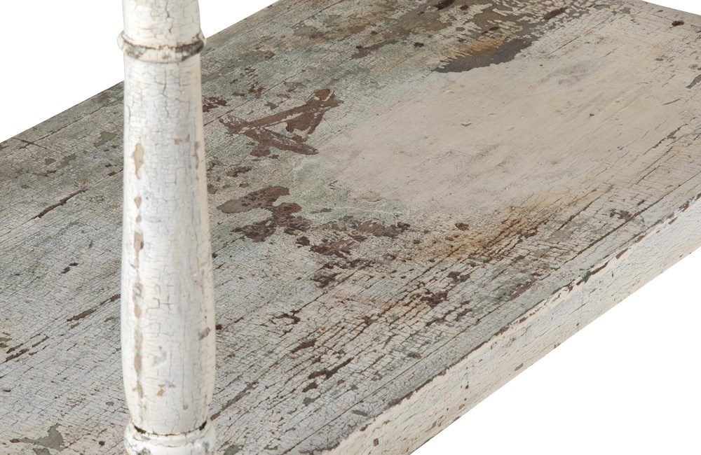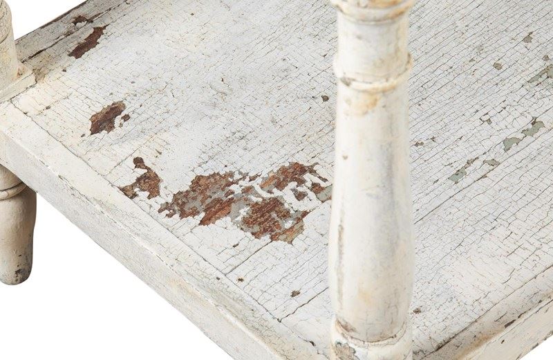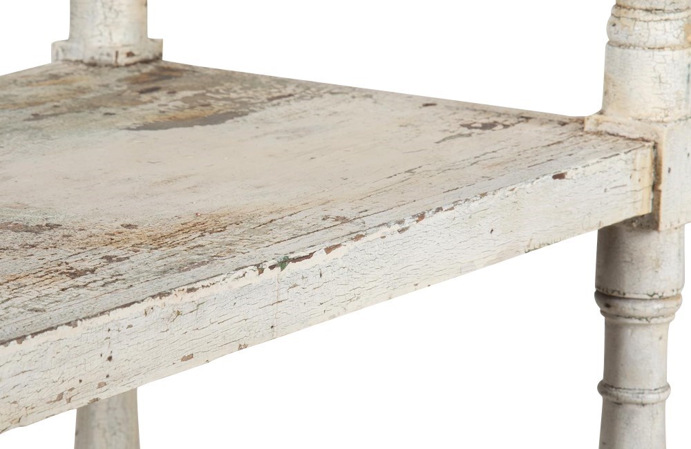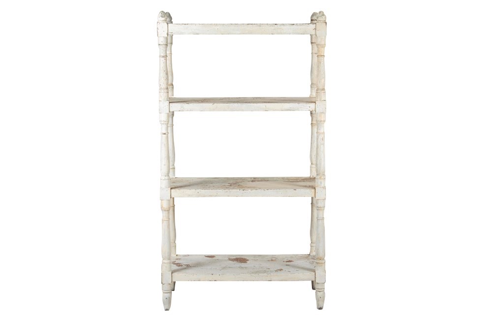 Four tiers retaining their time worn paint. The top shelf with turned finials to each corner.