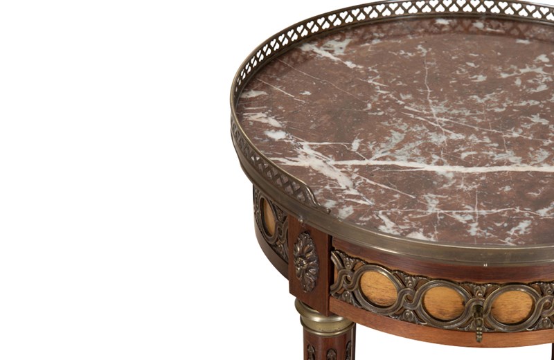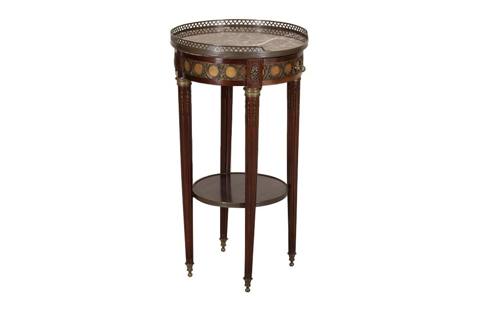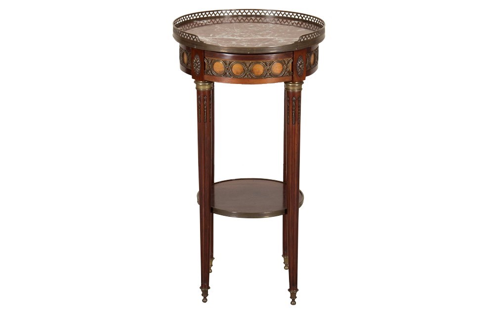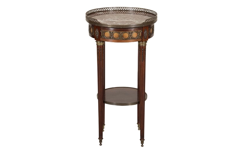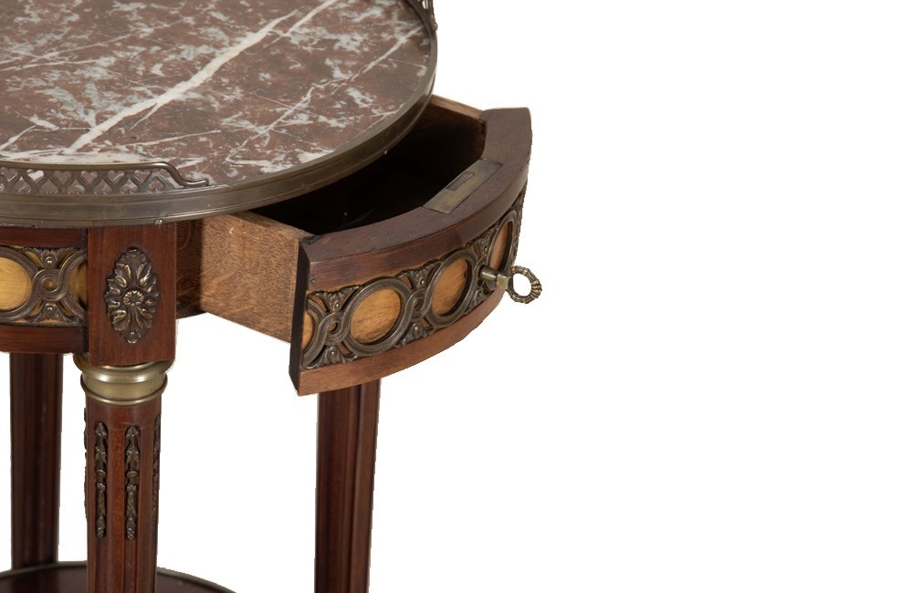 Elegant French walnut gueridon table, finely crafted in the Louis XVI style. It features a richly veined marble top set within a raised pierced brass gallery. The apron is adorned with decorative gilt-bronze mounts and a central drawer. The slender, tapered legs are accented with fluted detailing and terminate with brass sabots, terminating in small ball feet. A lower tier with brass surround provides additional display space.