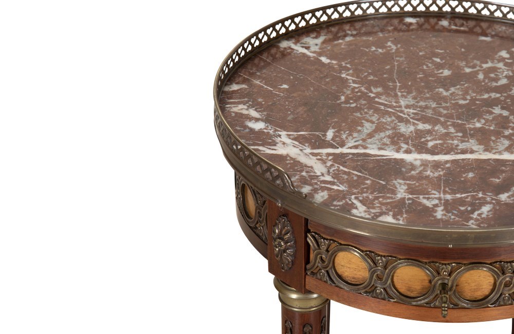 This elegant gueridon is perfectly scaled for use as a side or lamp table or accent piece. In the Faubourg St Antoine Paris style and quality. Late 19th / early 20th century.The key provided is for use as a handle and not for locking.