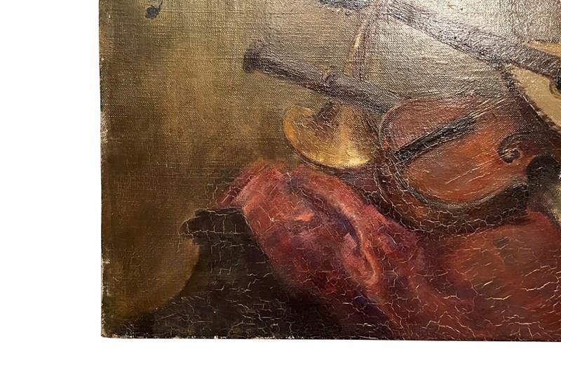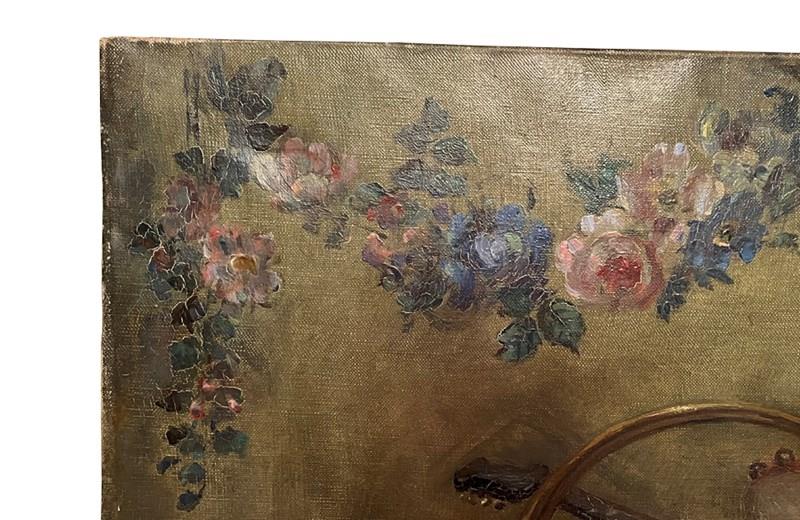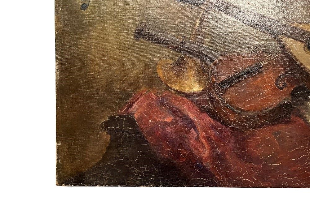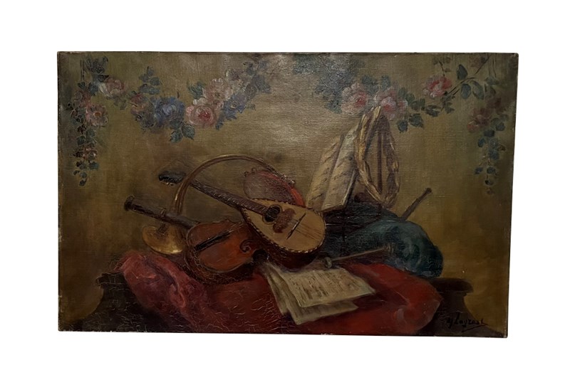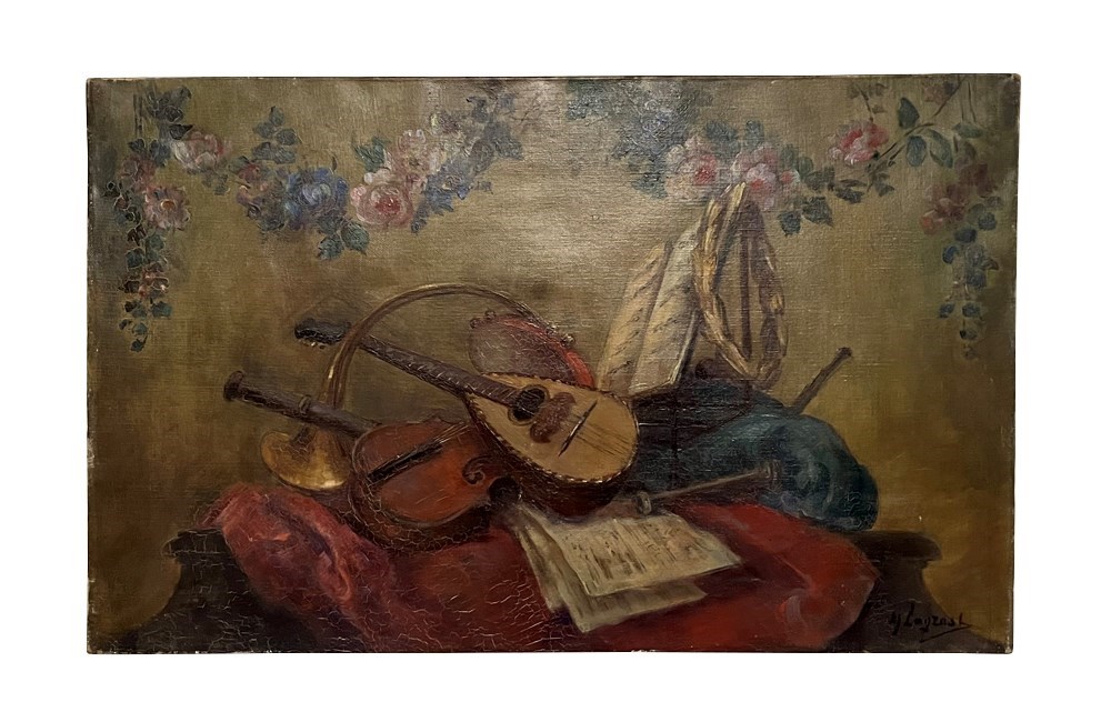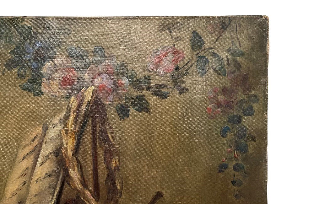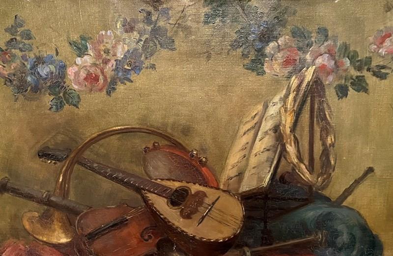 Neoclassical style music themed still life depicting music sheets and instruments beneathe a garland of roses.