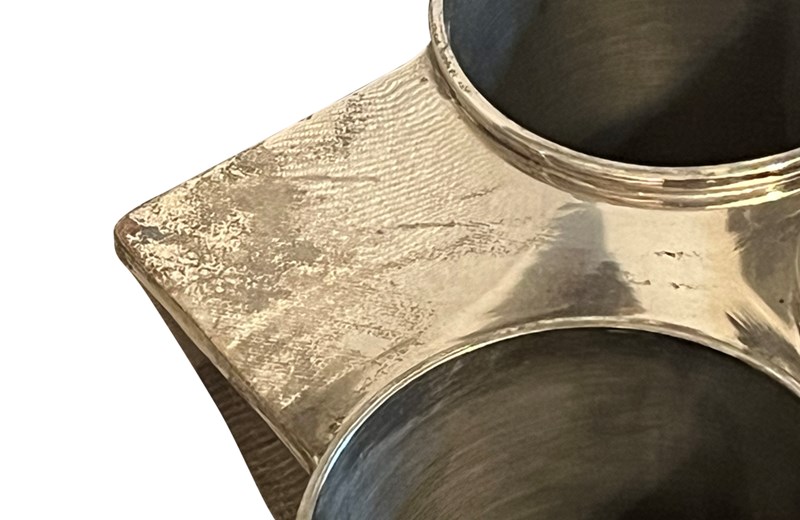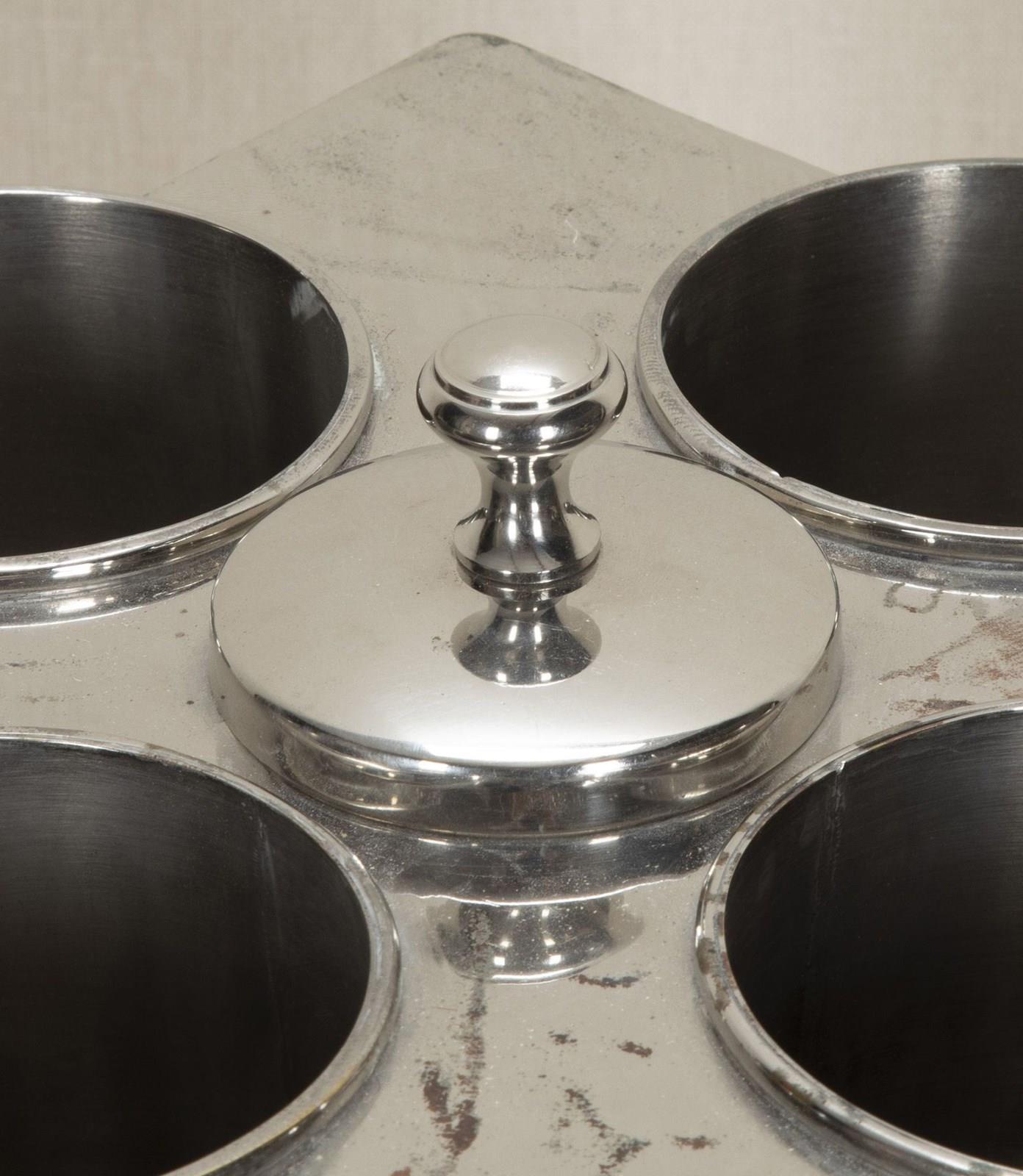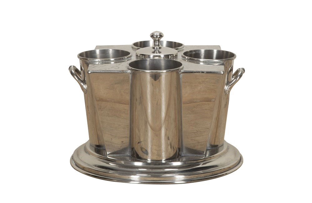 Of square canted form with central ice compartment and four bottle receptacles. With use related wear to the silver plate, detailed in photos. Circa 1970