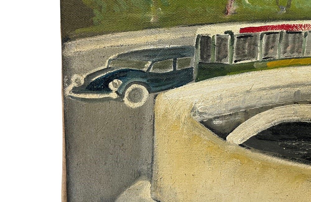 Depicted are vehicles crossing the bridge, including a DS Citroen, bus and van.