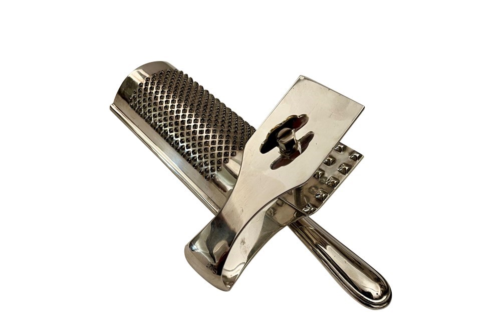 Elegant Mid-Century silver plate cheese clamp and grater set.