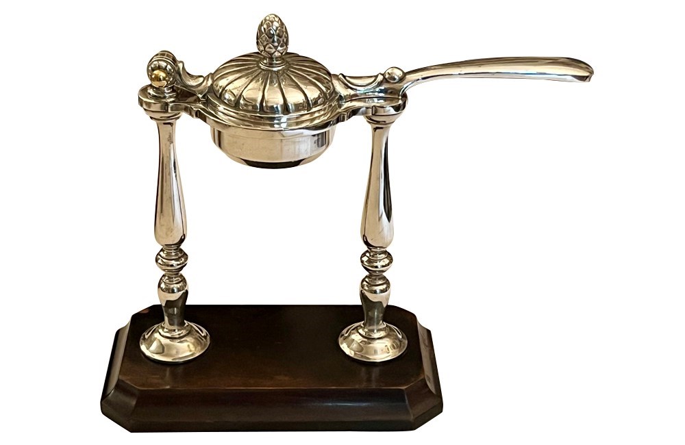With manual vice push down lever and pierced strainer insert. It stands on a rectangular wooden plinth. A perfect bar accessory to press fresh lemons and limes directly into your mixing vessel or glass.
