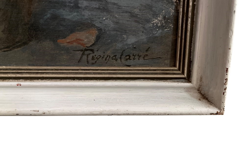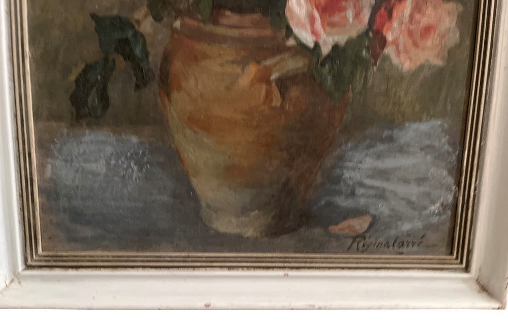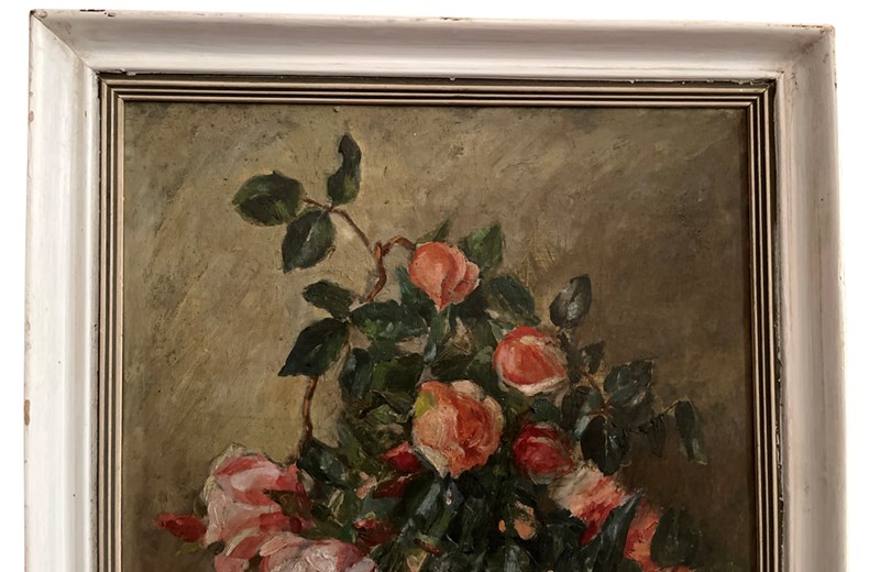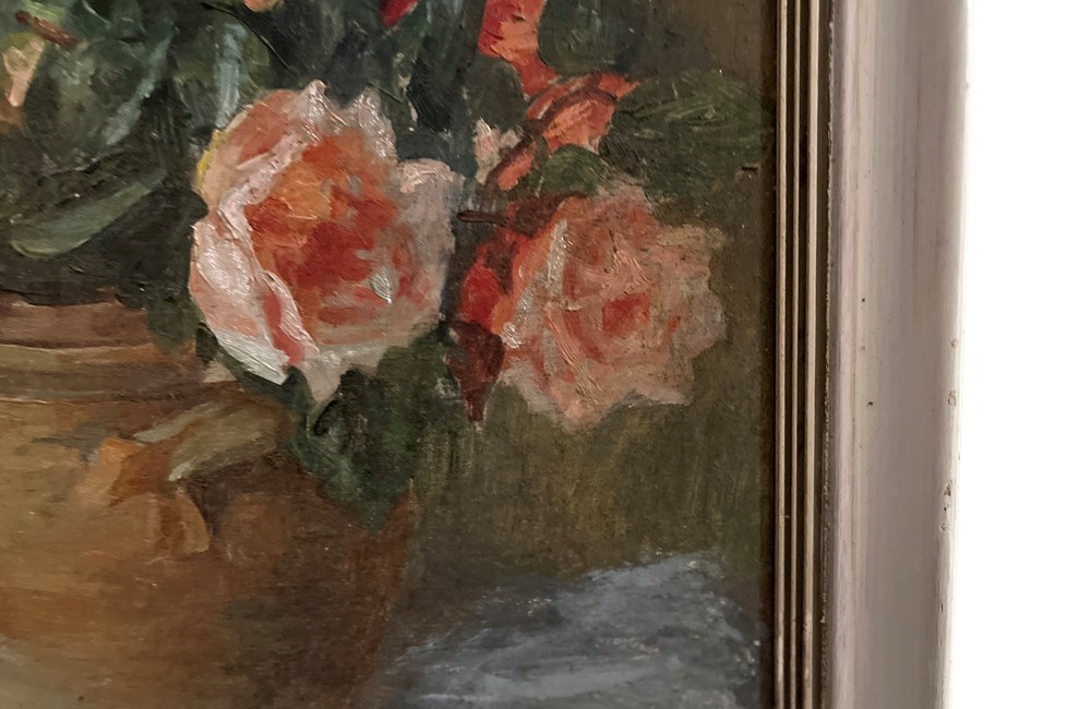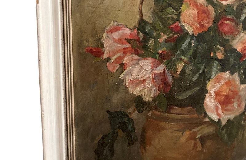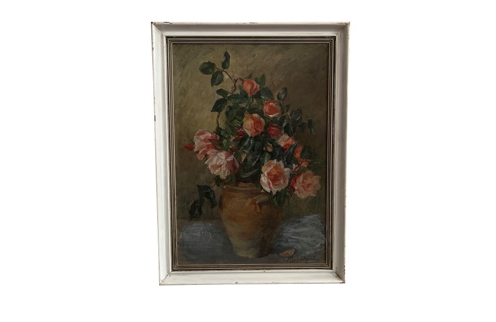 20th Century French still life painting of roses in a confit pot. Oil on wood in a painted white frame.