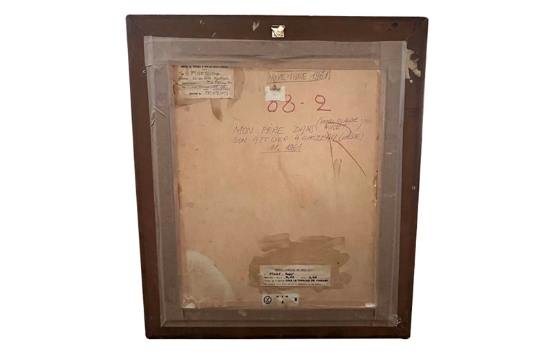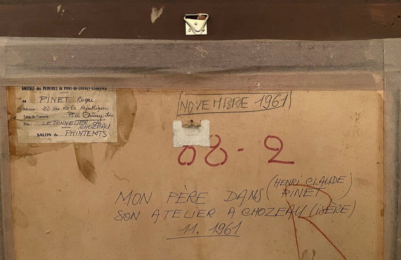 Depicted is a portrait of the artists father making wine barrels, his sleeping dog by his side. Annotated to the rear 'Mon Pere, (Henri Claude Pinet) dans son atelier a Chozeau (Isere), 11 1961'.