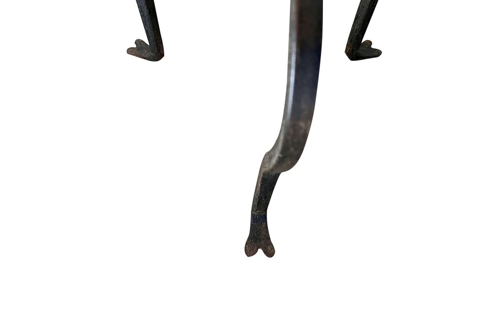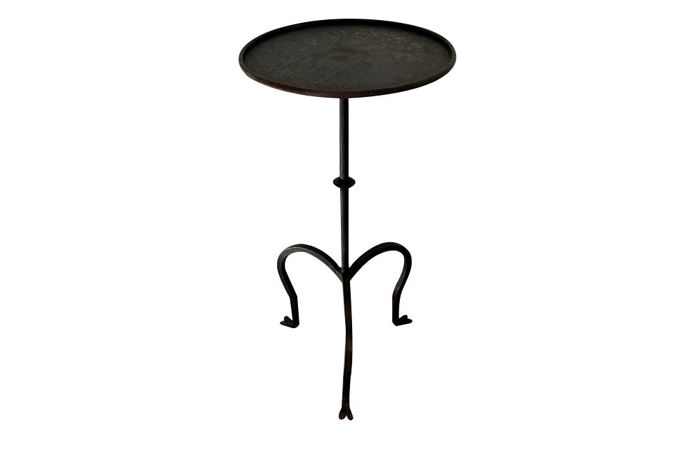 Chic little Mid-Century Spanish iron cocktail or martini table with raised rim to top. Circa 1960.