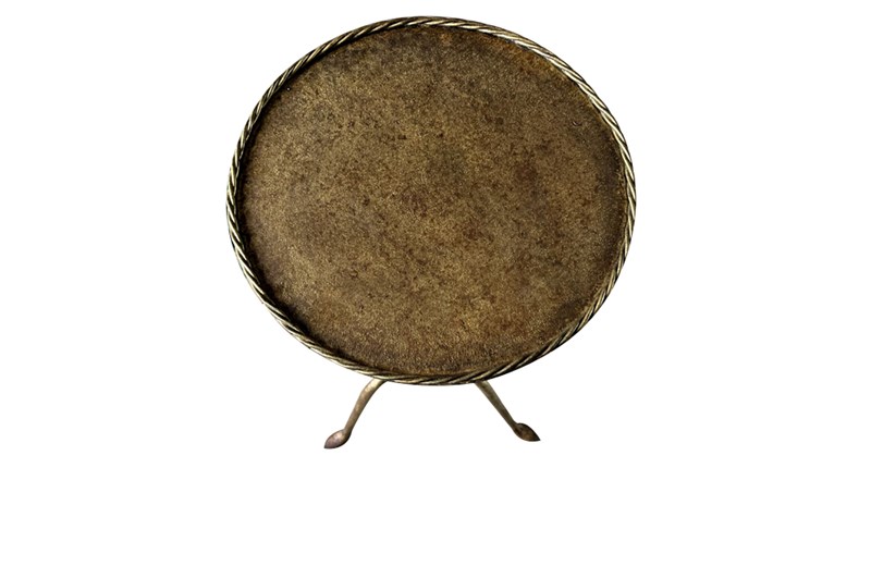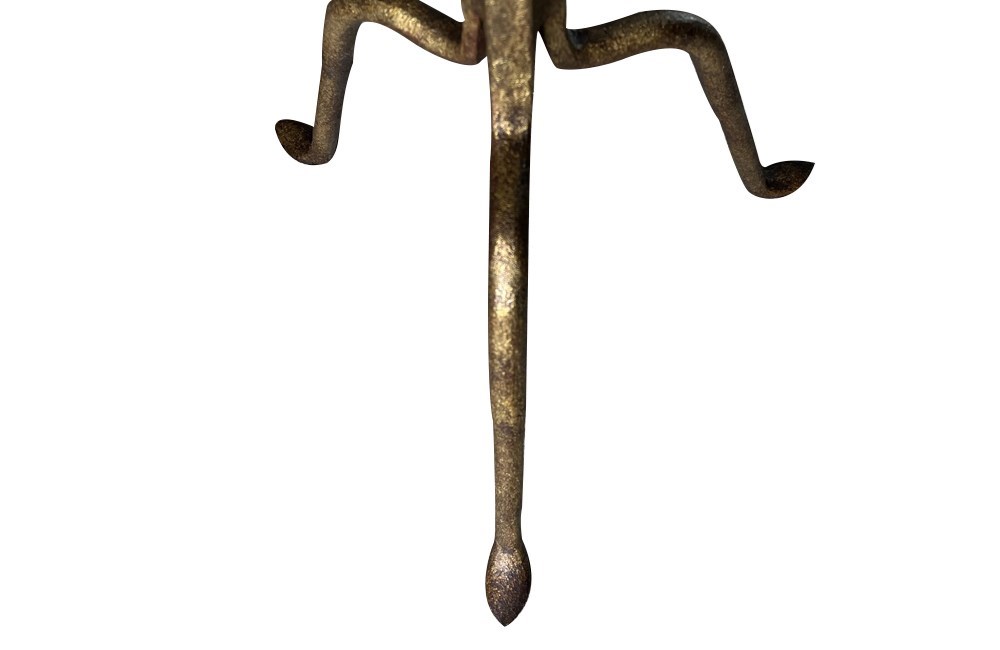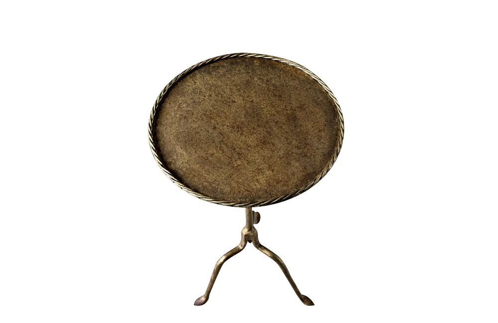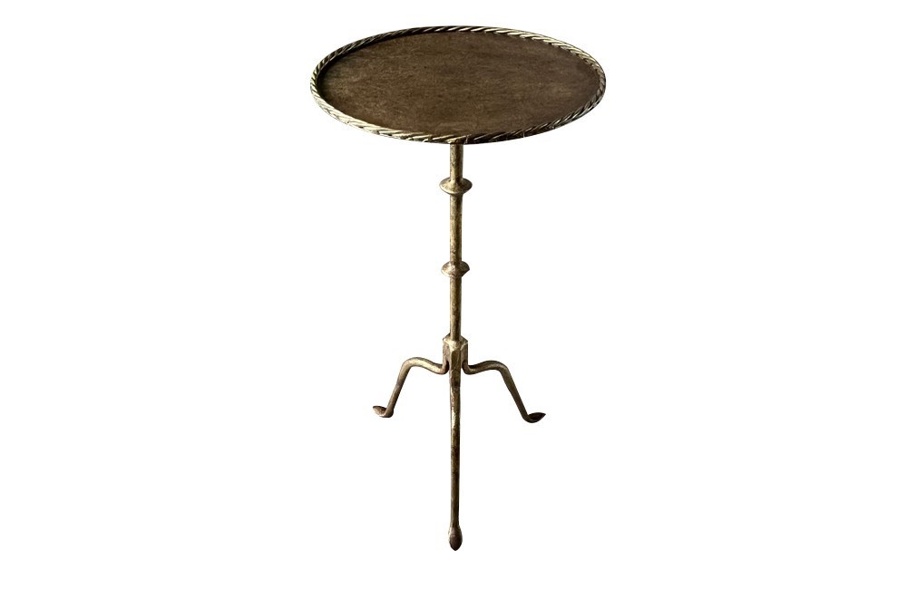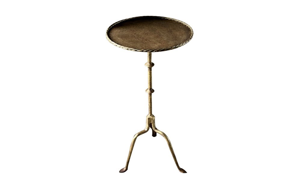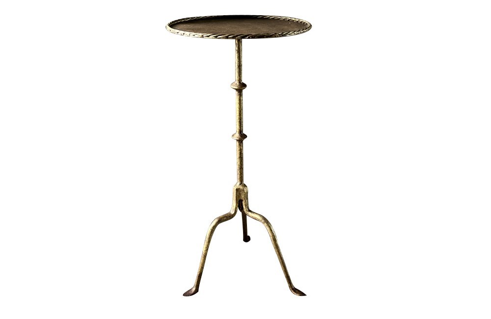 Chic little Mid-Century Spanish iron cocktail or martini table with rope rim to top.