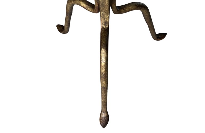 The downright bears two central rings and terminates on a tripod base with splayed legs and stylized spade-form feet.