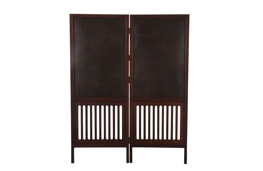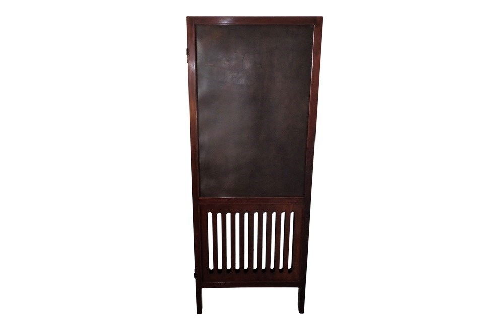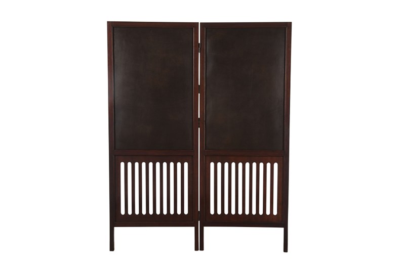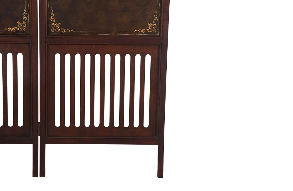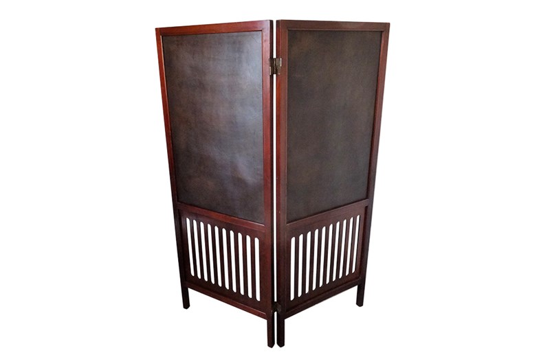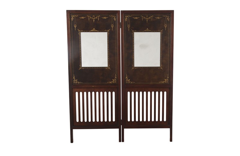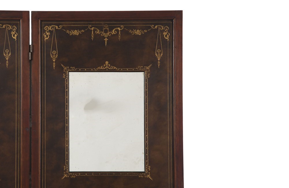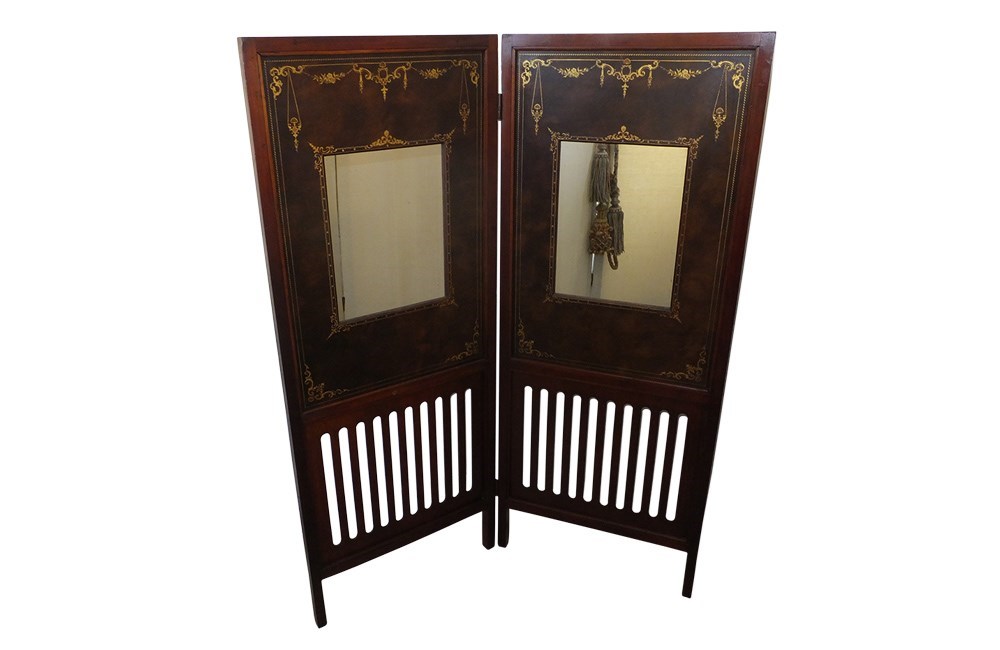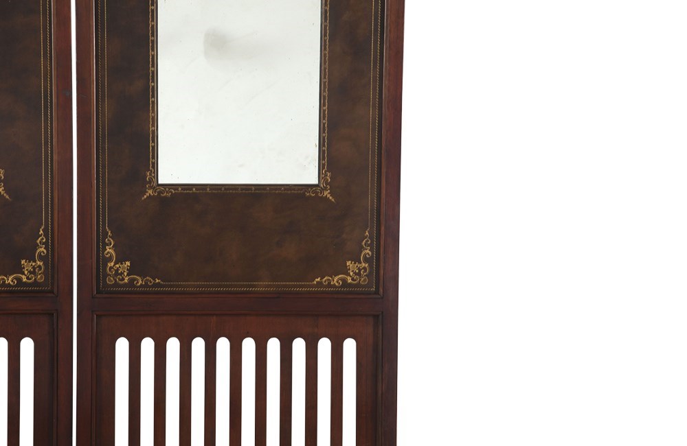 Mahogany, two-fold screen with embossed leather framed mirrors and leather backs.