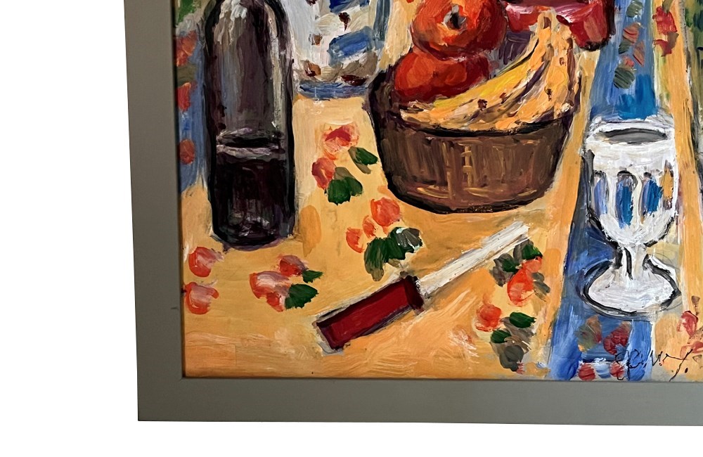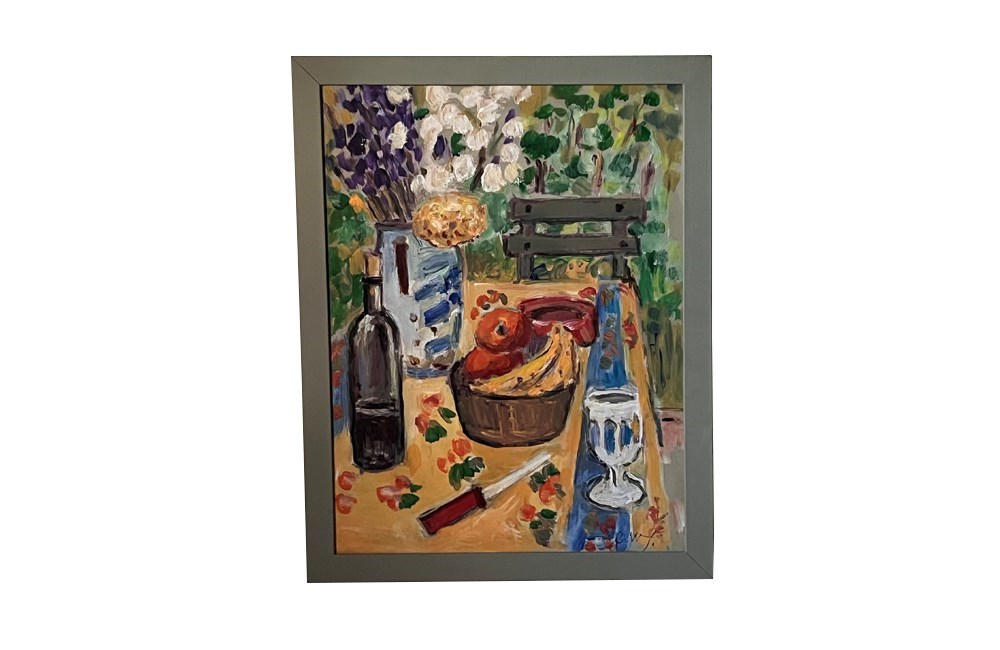 A lively Provençal still life by Claude Gémy, featuring fruit, wine, flowers, and a sunlit garden bench beyond the table. Painted in gouache with his characteristic bright palette and loose, expressive brushwork, the composition captures the warmth and everyday charm of southern French life. The use of saturated colour and simplified forms reflects Gémy’s intimate, joyful approach to domestic subjects.