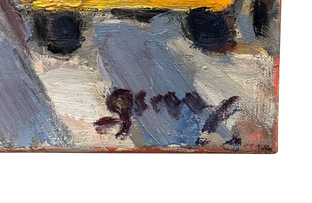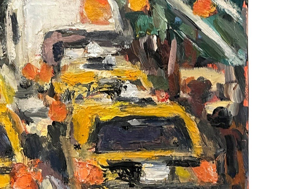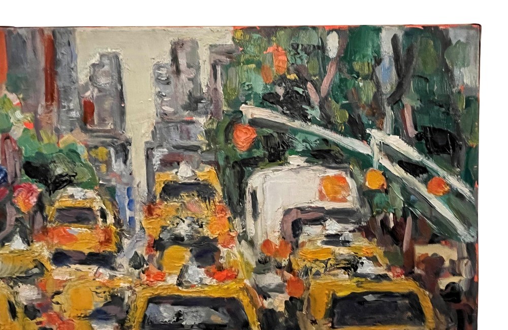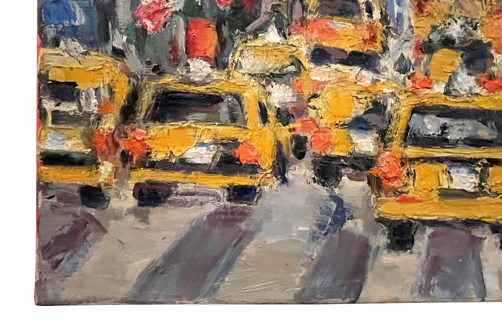 Executed in oil on canvas, the work features a rich impasto surface, with confident strokes and a dynamic palette that emphasises the warmth of the taxis against cooler street and architectural tones. The artist’s loose, gestural style evokes the rhythm and vitality of urban life.