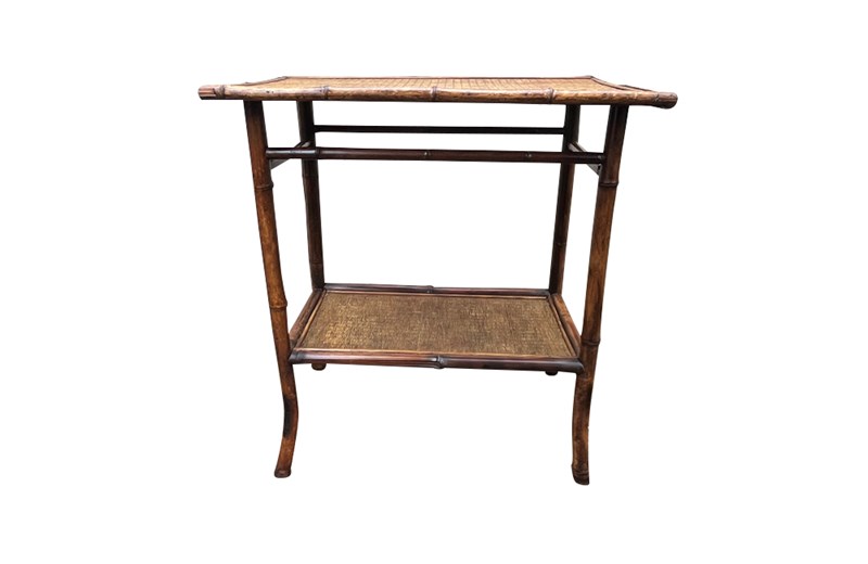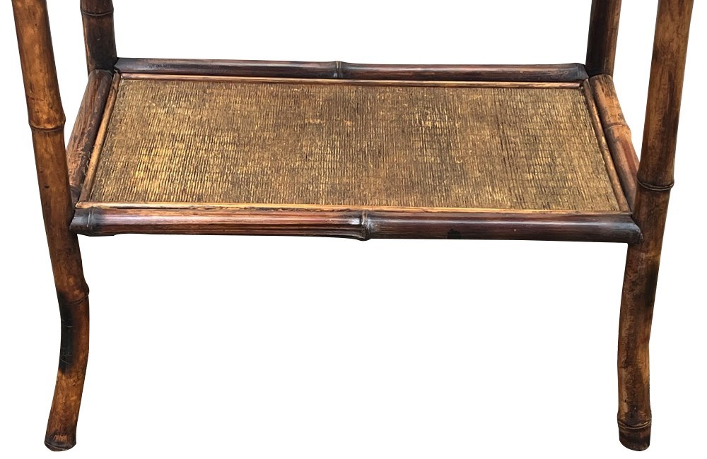 Early 20th Century French bamboo side table with two rattan shelves. Circa 1920