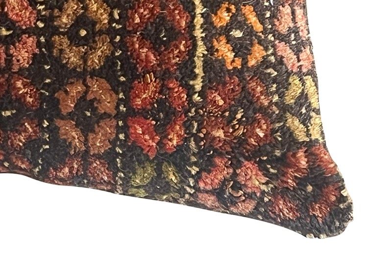 Handcrafted from an authentic antique Persian Kurdish village rug, this decorative cushion features a richly textured field of small floral rosettes arranged in a dense, rhythmic pattern. The palette blends warm brick red, rust, soft pink, ochre, and muted green against a deep charcoal ground, creating depth and visual warmth.