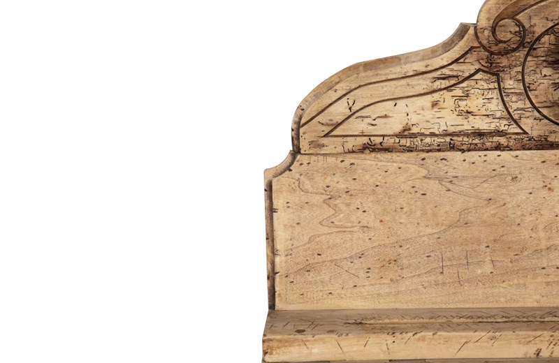 The hardwood chopping surface top is beautifully worn with deep, honest wear acquired through decades of use. The block is raised on turned fluted legs with a shaped apron and fitted with a single drawer retaining its original iron handle. To the rear is a decoratively shaped and carved backboard embellished with an iron boars head and a knife slot. Iron corner straps.
