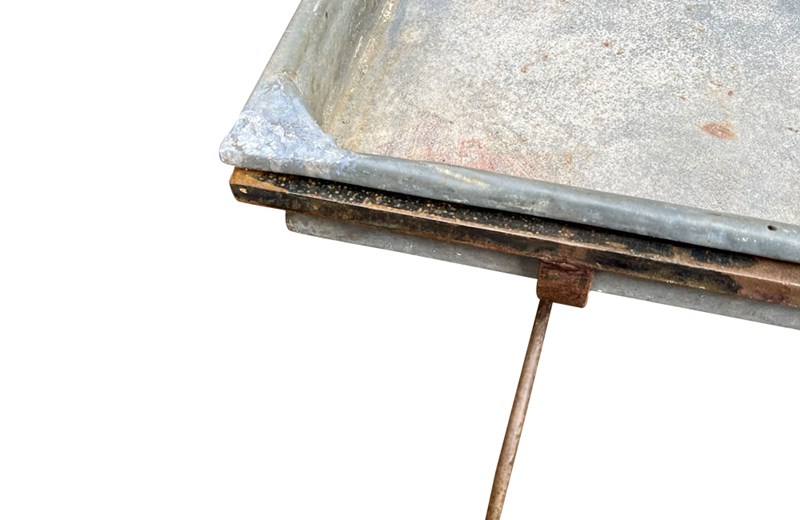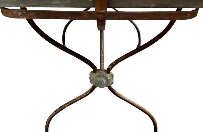 The removable tray, originally designed for preparing and displaying flowers, sits within a finely worked frame with curved legs and central cast rosette motifs. The zinc surface has developed a soft, time-worn patina, while the iron base retains its original aged finish. The legs terminate in small cast pad feet, giving the piece a refined, sculptural stance.