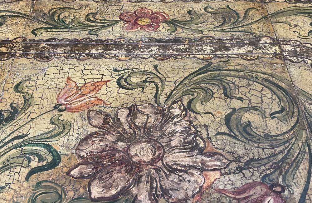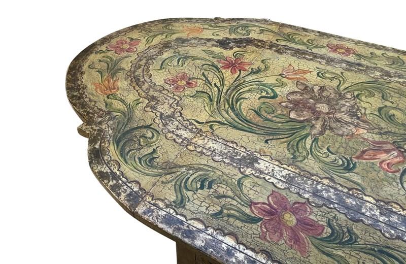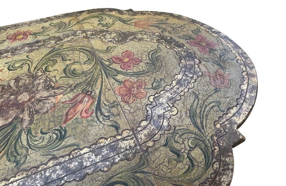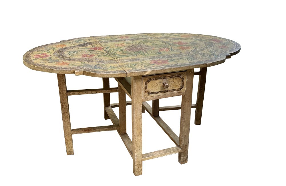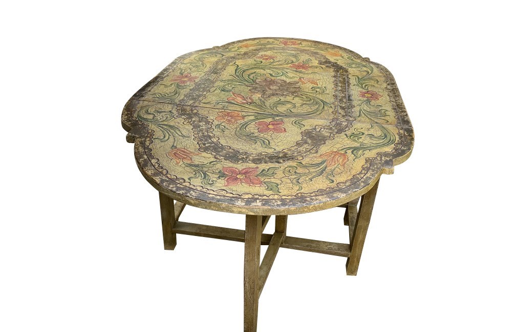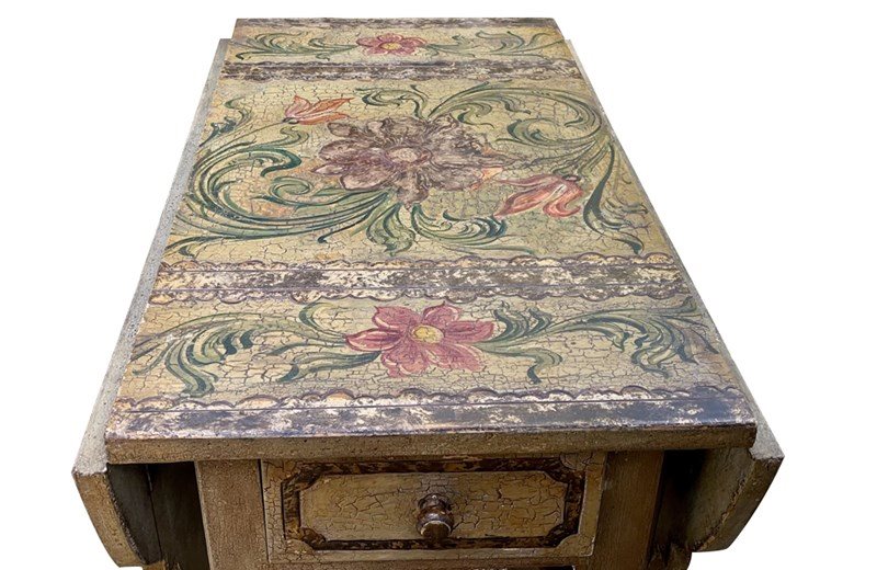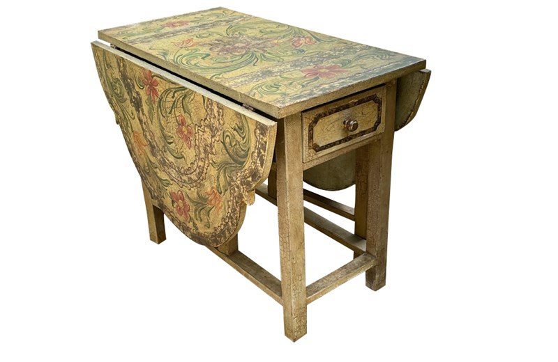 Charming Italian drop-leaf table with a hand-painted top decorated in scrolling foliate and floral motifs in warm ochre, green, lavender and terracotta tones.
