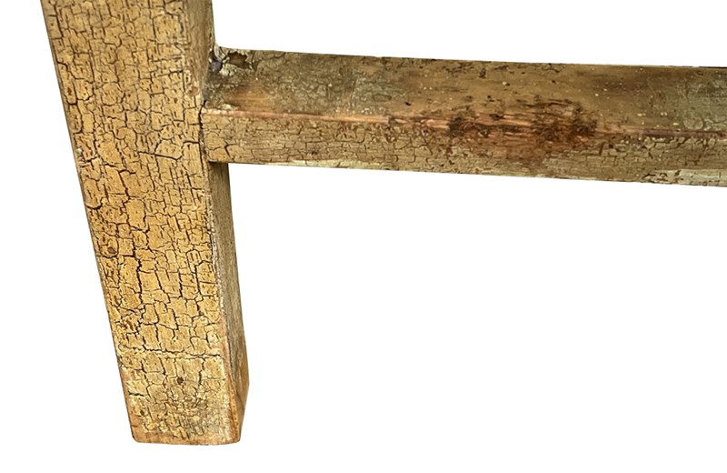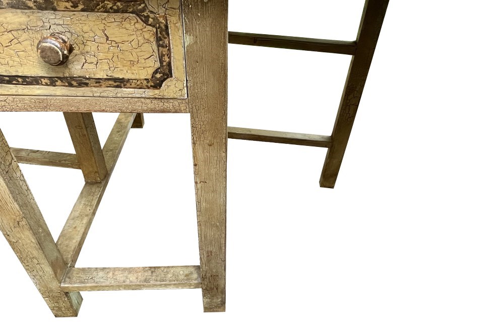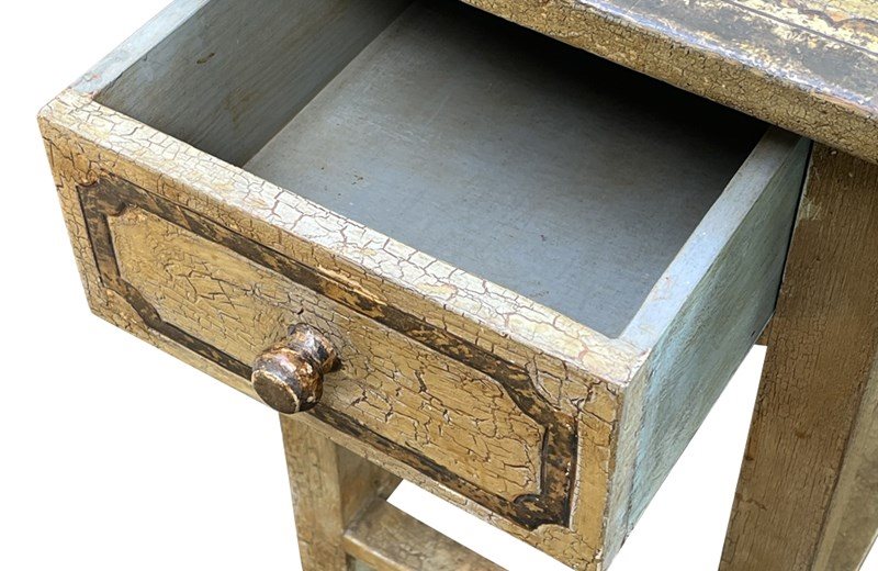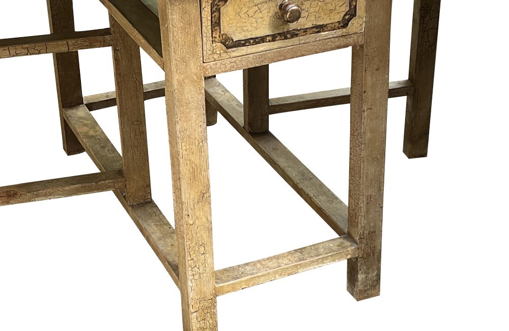 The table retains its original painted finish with attractive craquelure and age patina. A single frieze drawer with a wooden knob adds practical storage, and the simple trestle-style base provides sturdy support.