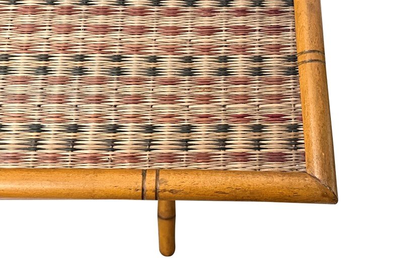 Folding faux bamboo table with coloured rattan top.