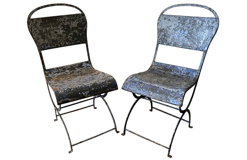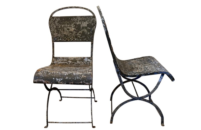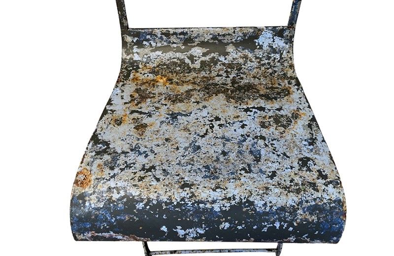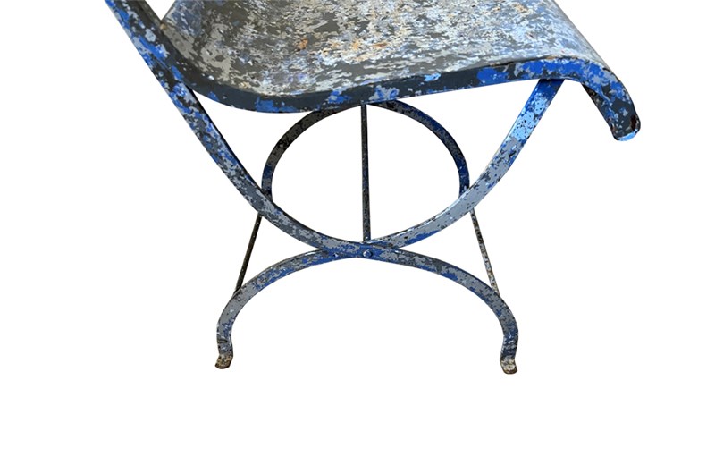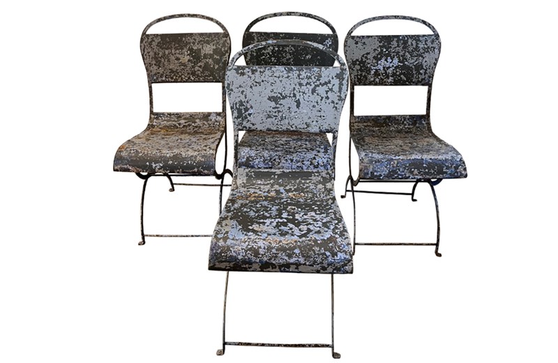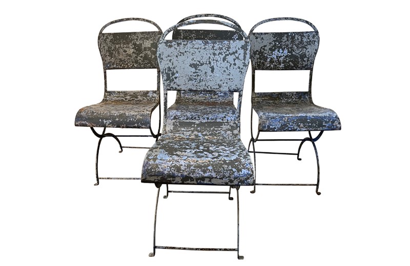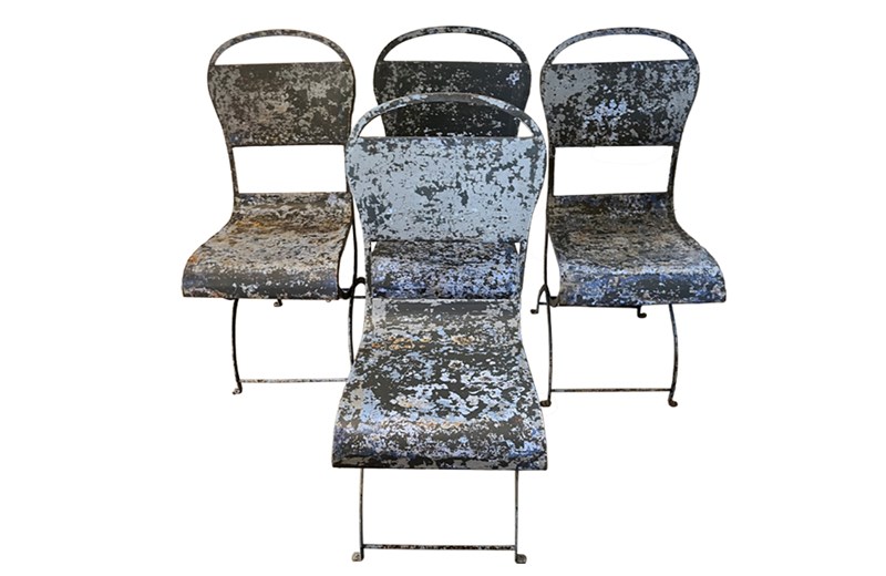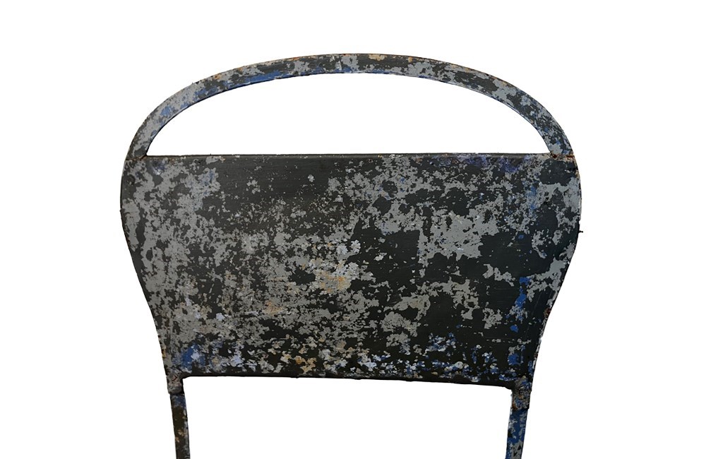 Set of four French iron chairs with fabulous patination and blue colour. They work perfectly as interior chairs as well in the garden, courtyard or terrace.