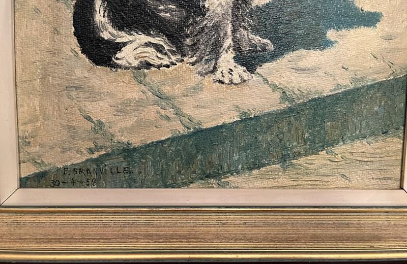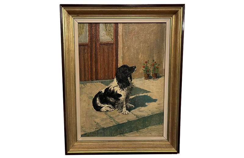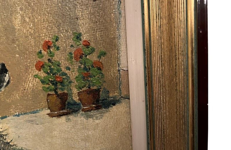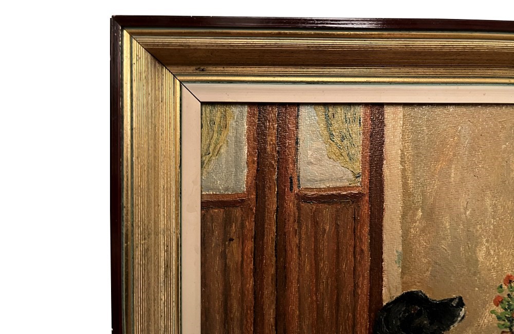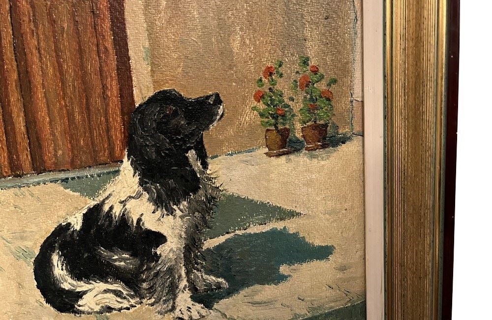 Charming framed oil on wood painting of a black and white spaniel dog wiith potted red geraniums.