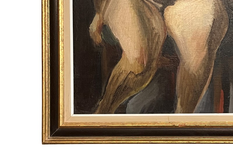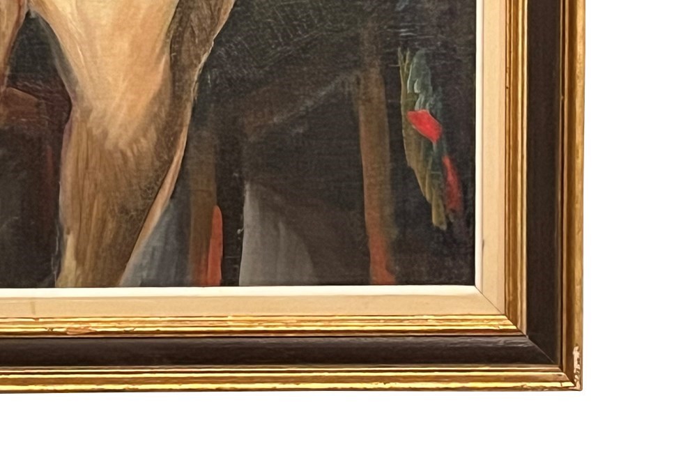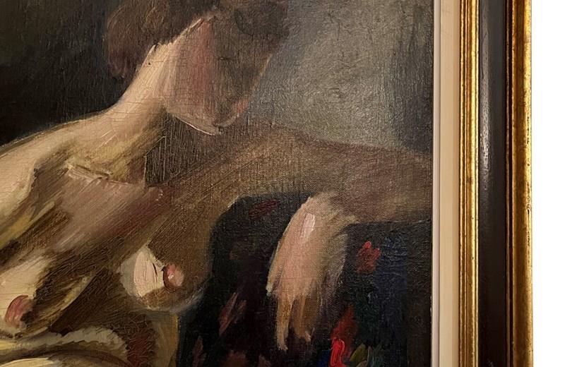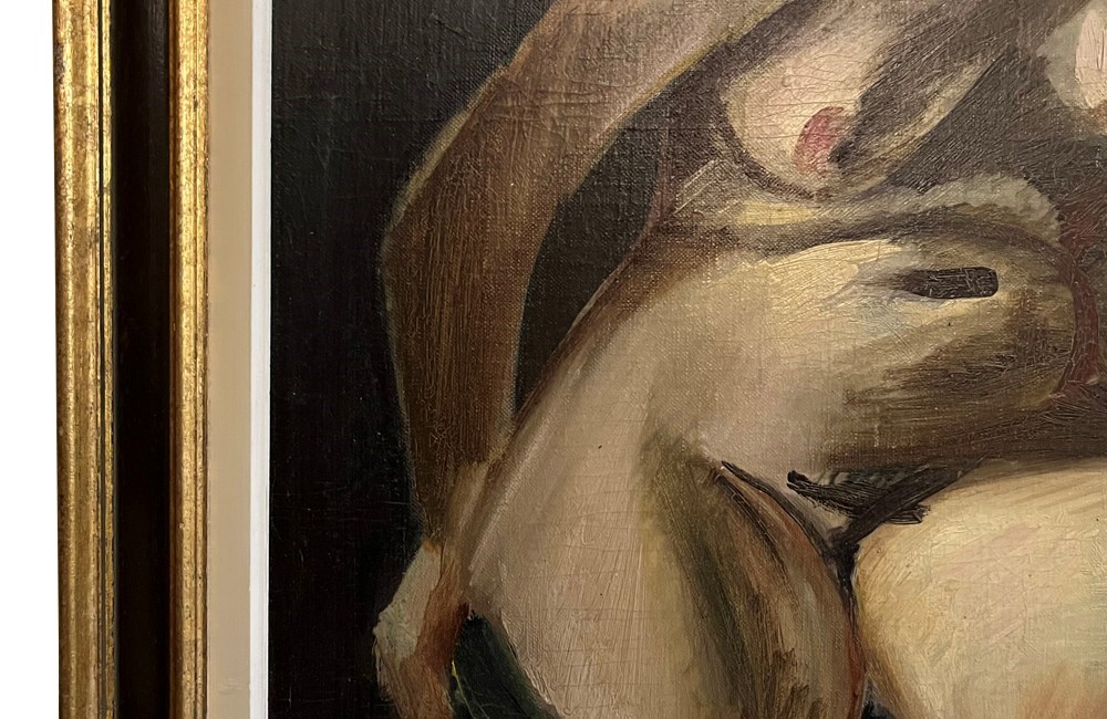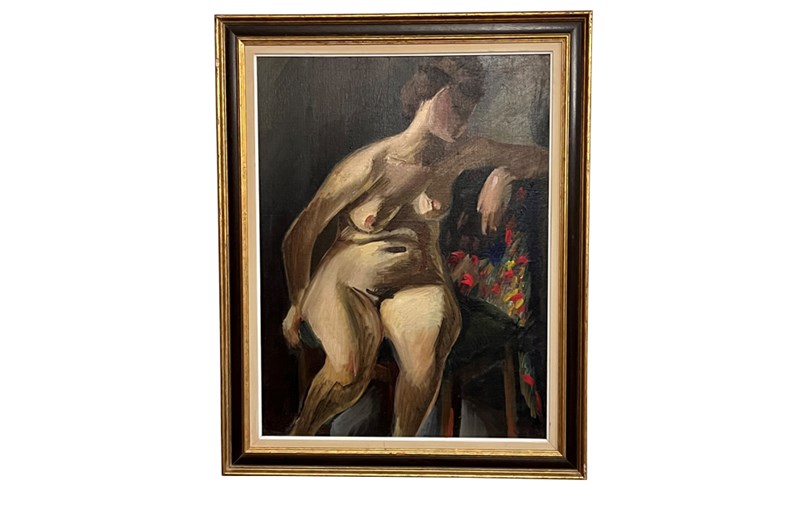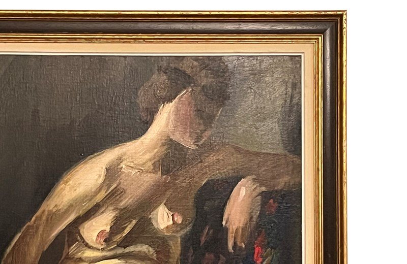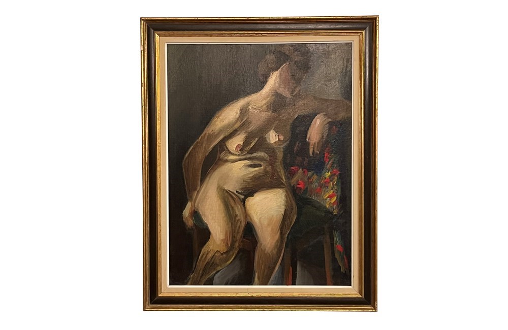 Mid-20th Century French, framed oil on wood portrait of a seated female nude.