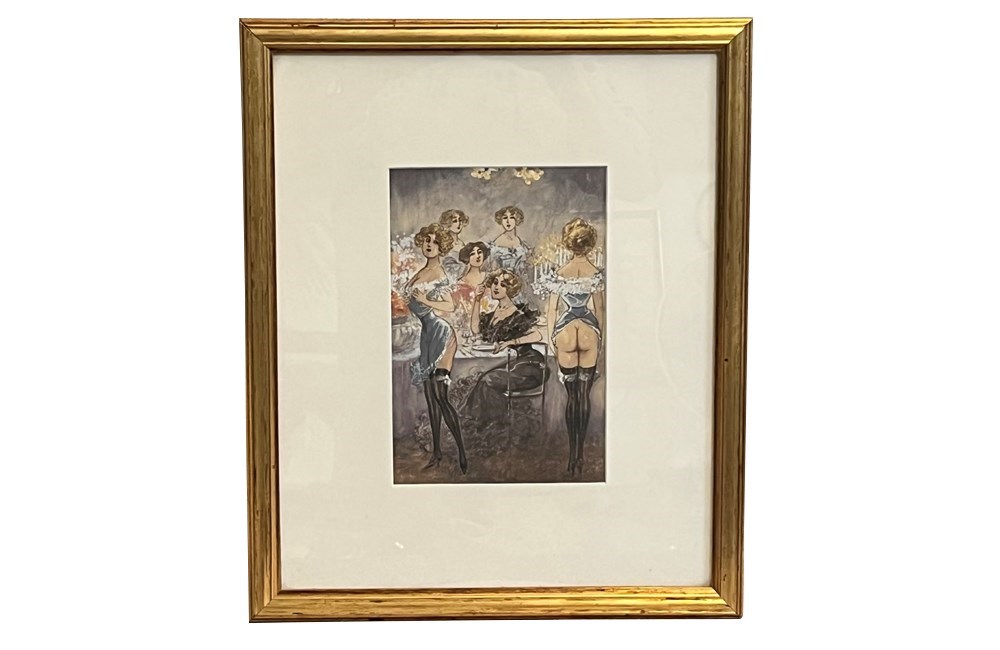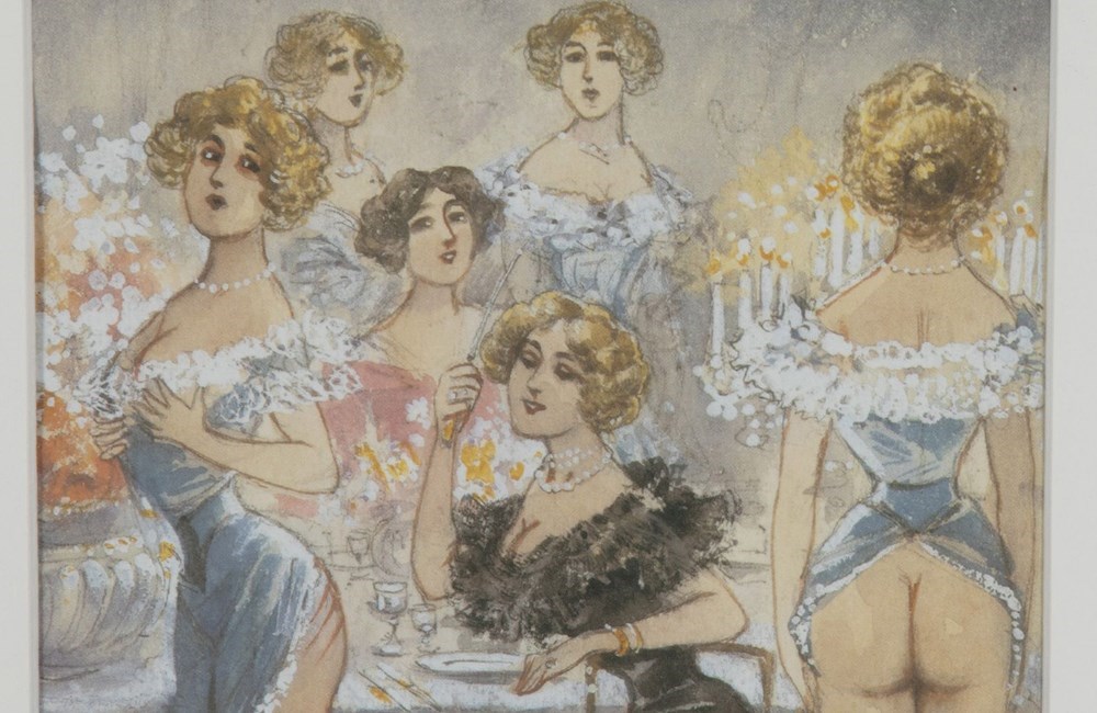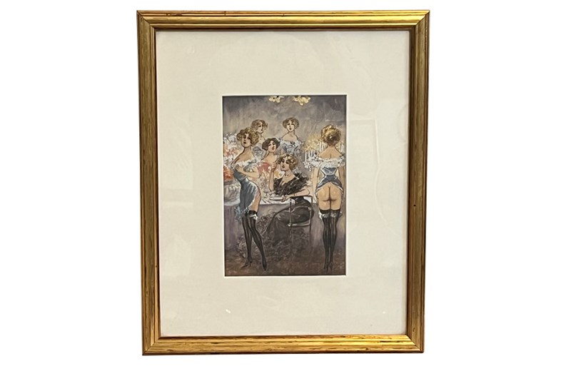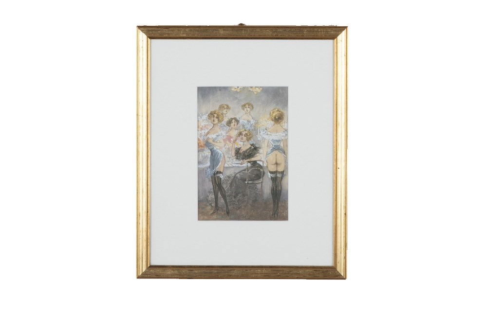 Original unsigned watercolour on paper depicting a cheeky theatrical Belle Époque cabaret salon scene, likely Parisian, circa 1895–1915. The composition features elegantly posed female performers in period costume, rendered with soft, atmospheric washes and fine line work typical of turn-of-the-century French illustration.