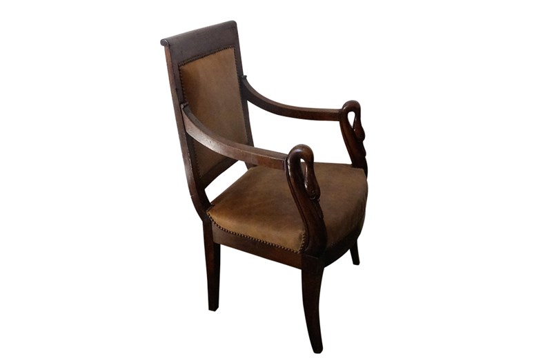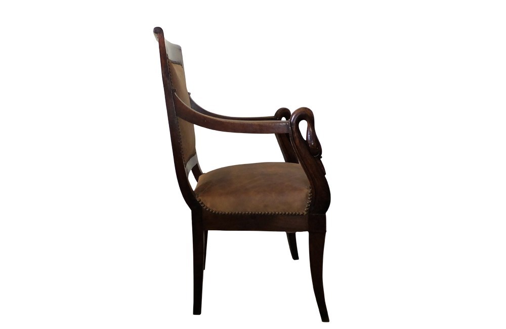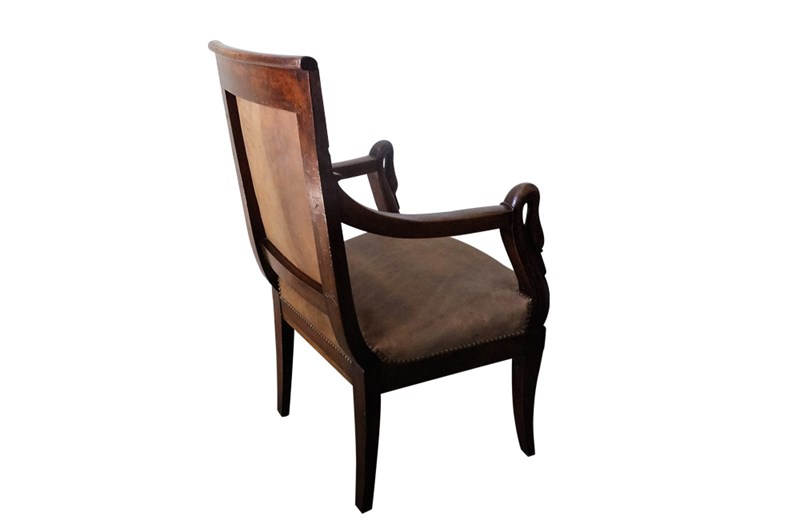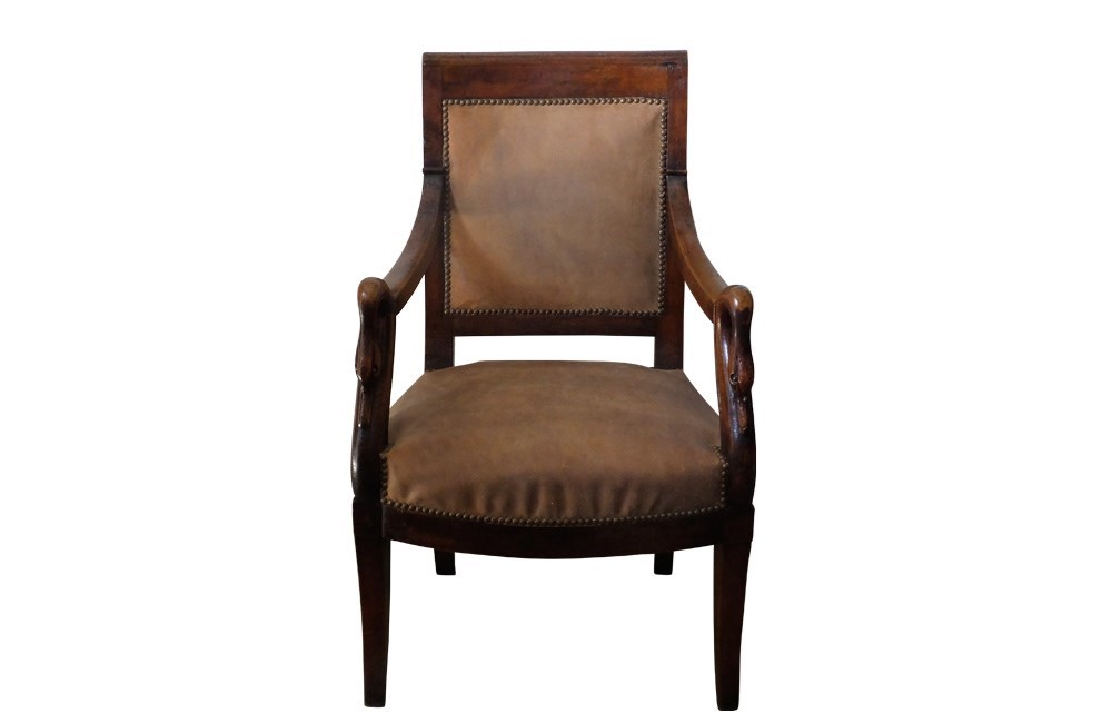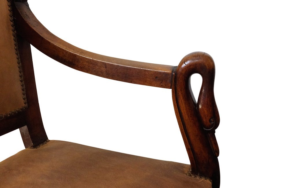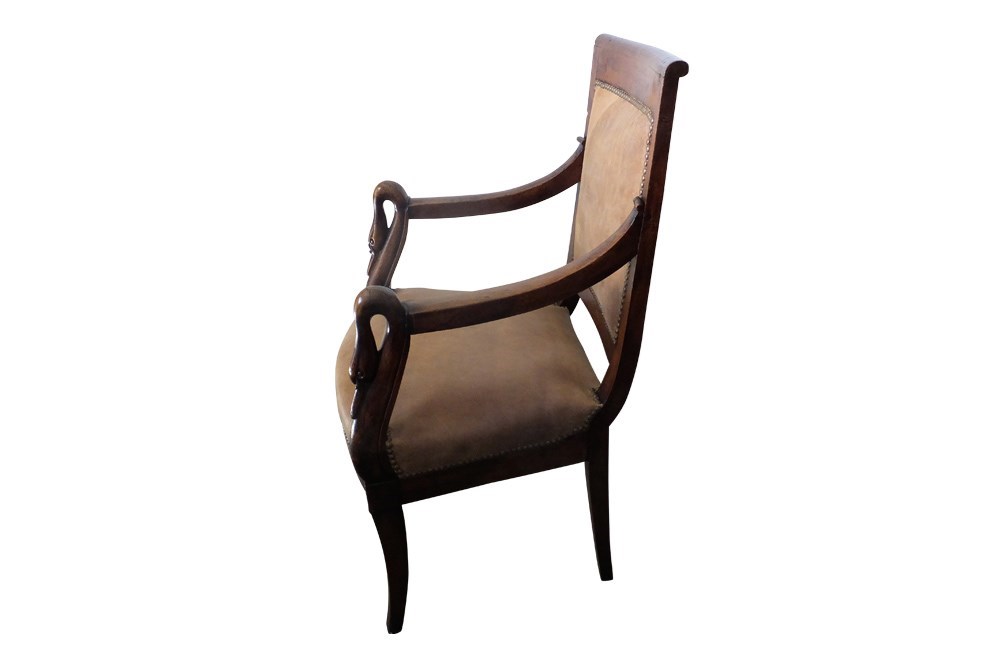 This elegant fauteuil de bureau dates to the early nineteenth century. The arms terminate in swan heads.