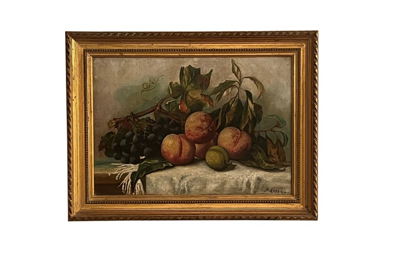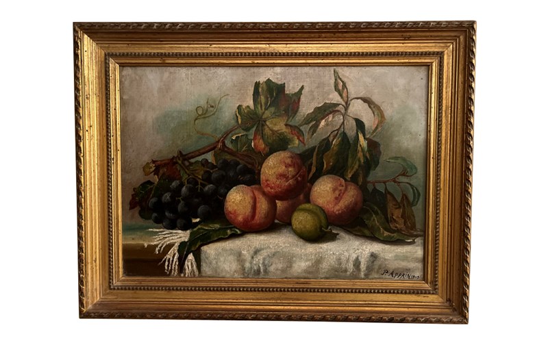 French Framed Still Life Oil Painting 'Grapes And Peaches'