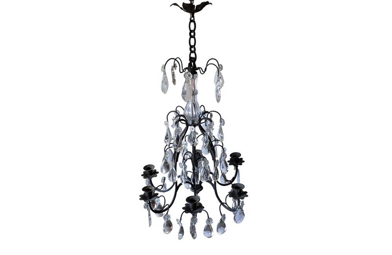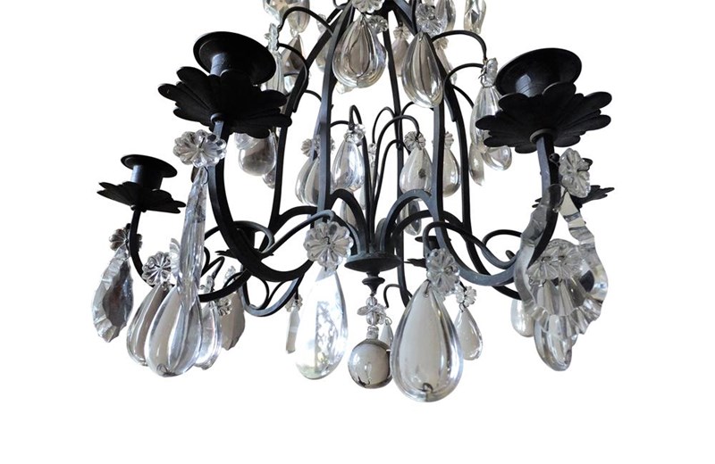Pretty French iron chandelier with clear crystal drops. Circa 1940