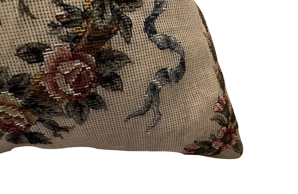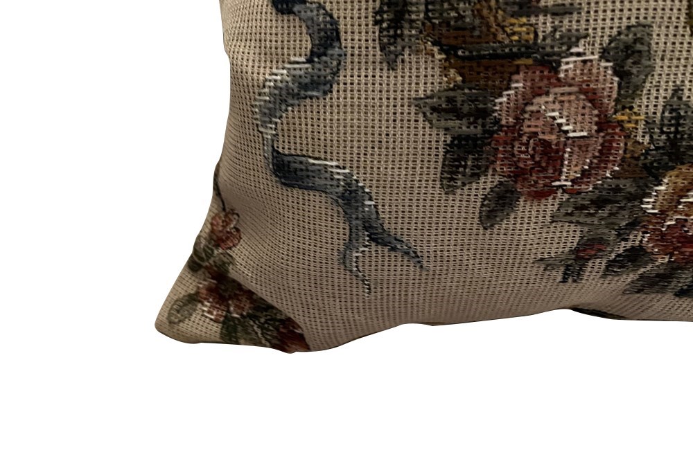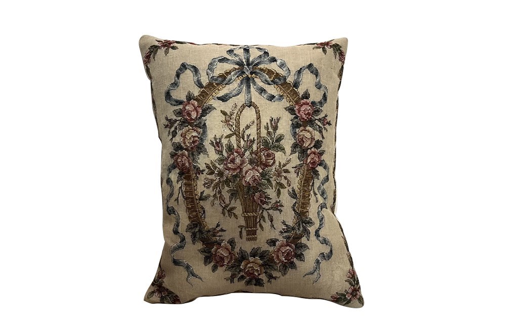 Featuring a classic floral basket motif with ribbon detailing. The front is needlepoint tapestry paired with an antique linen back. Feather-filled for comfort and weight.