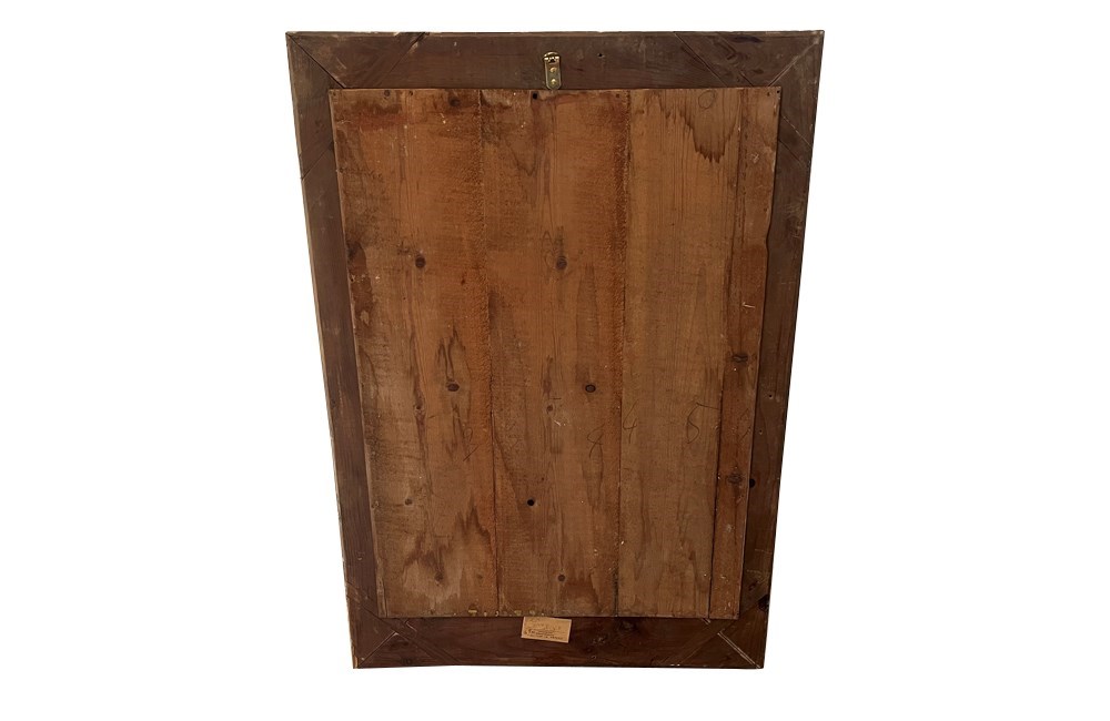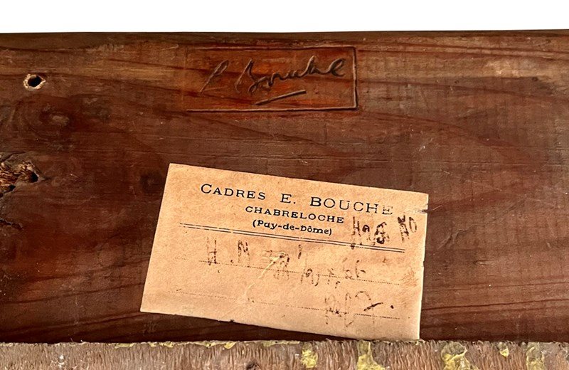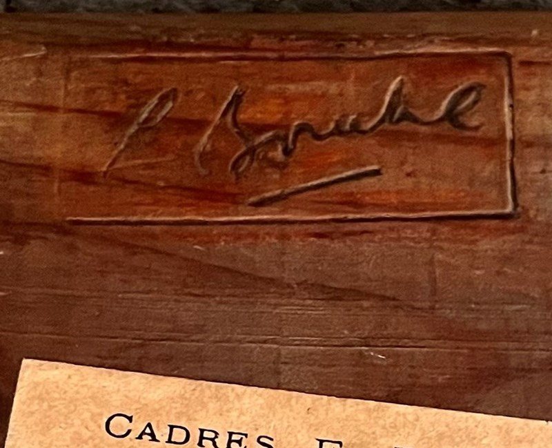 The carved framed bears the stamped signature and label of the renown name of Emile Bouche. In typical surface pattern of the Bouche name.