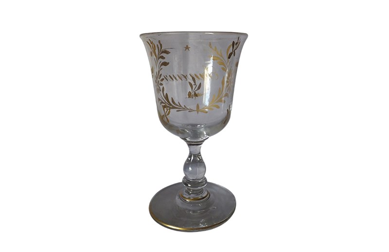 Pretty wine glass with gilt decoration inscribed with the word 'Souvenir'. These glasses were given to the recipient as a token to remember a special event such as a wedding, birthday, anniversary, etc,